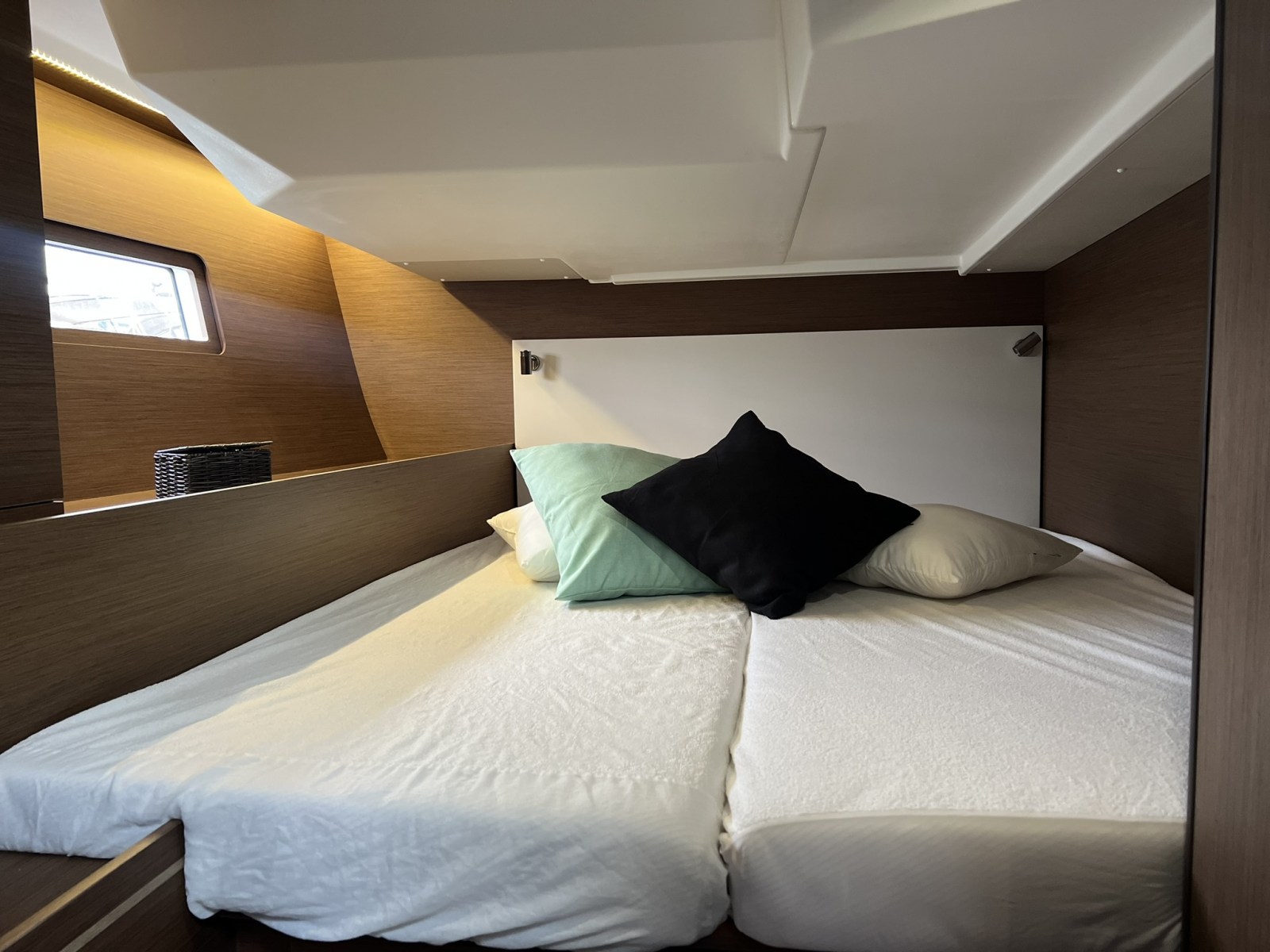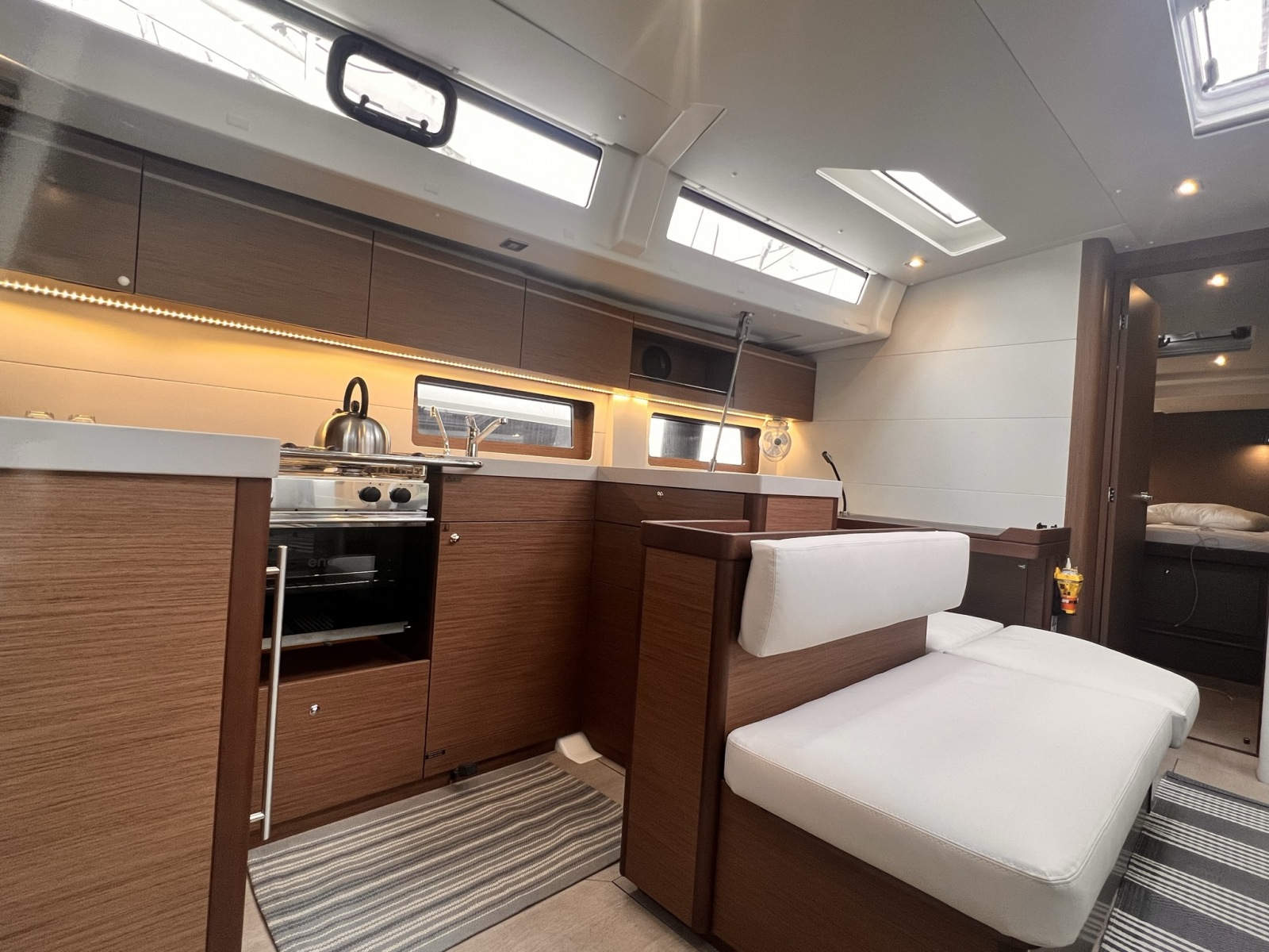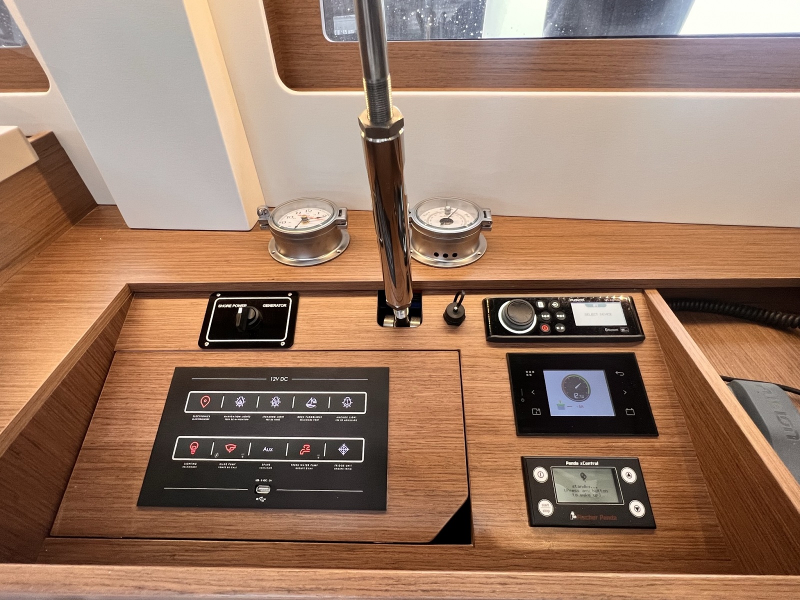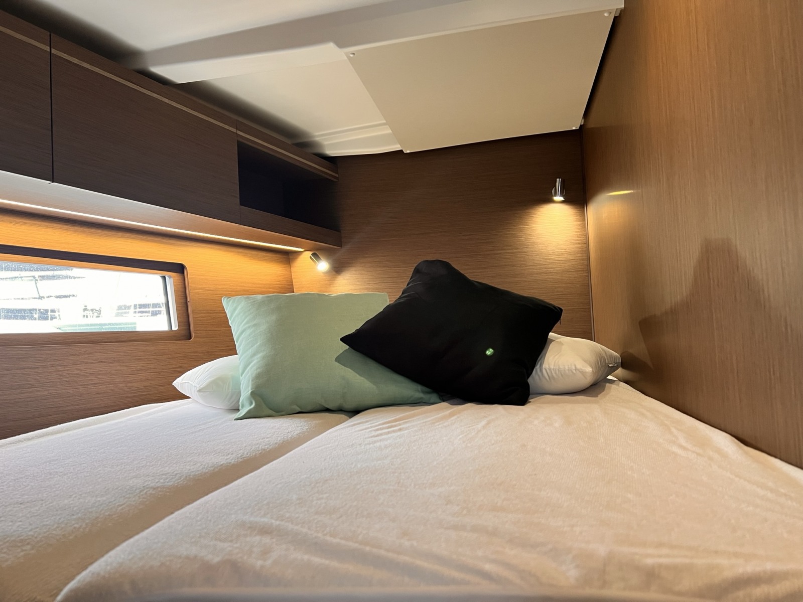 | Inside | Freshwater pump, Fusion sound system , Freezer, Generator, Airconditioning (independent from shore power), Cool box, Refrigerator, Battery charger, Speakers in saloon, LED interior lights, Mosquito nets, Radio, Convertible salon table, Cabin & dining area fan |