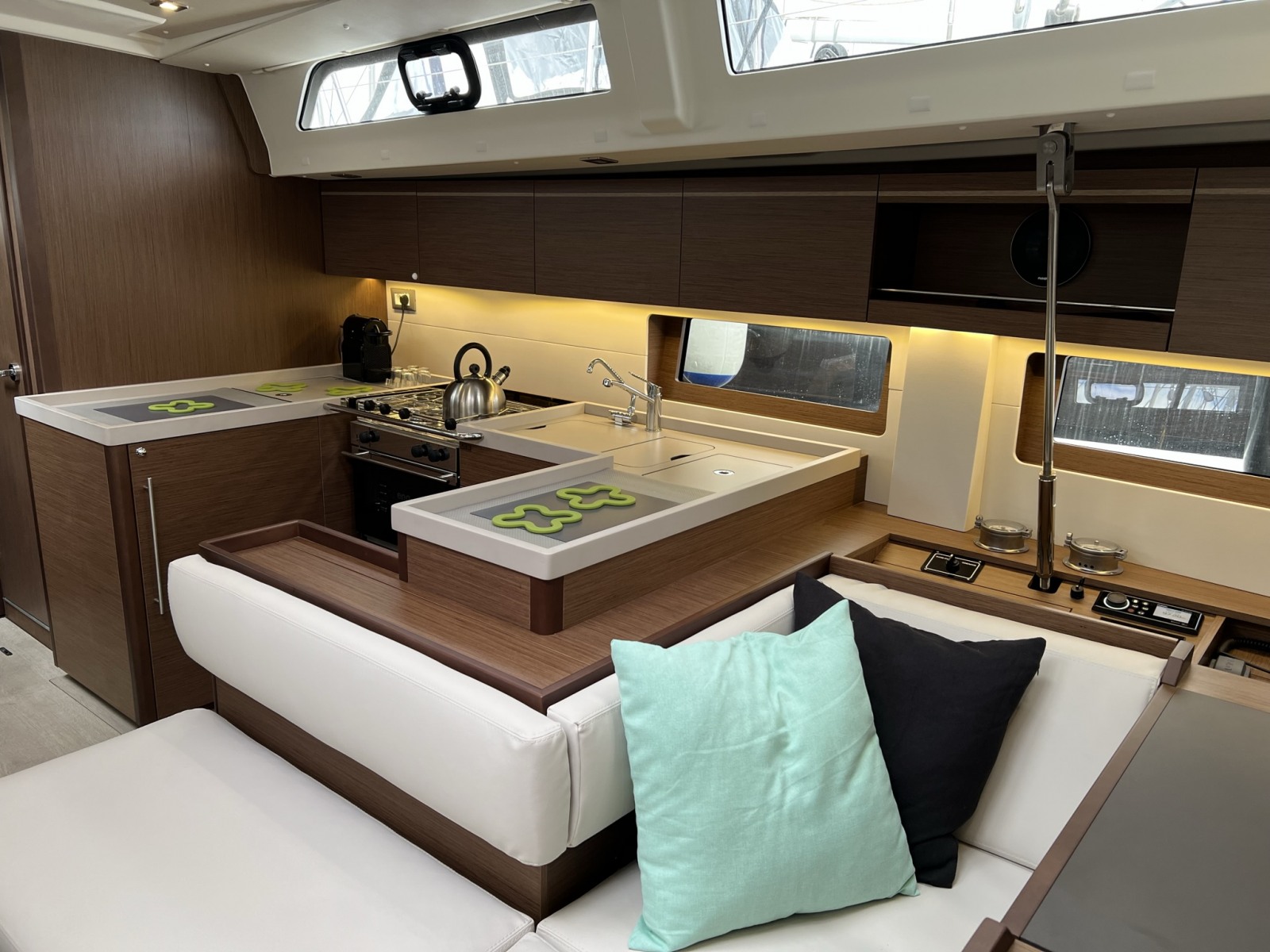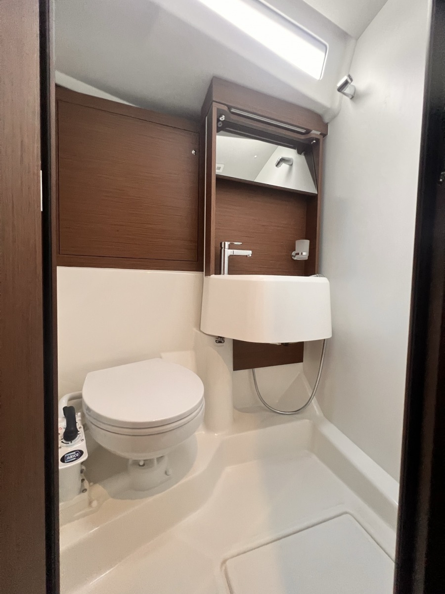 | Outside | Bimini top, Cockpit speakers, Cockpit light, Cockpit table, Electr. anchor windlass, electr. winch, Genoa winches, Sprayhood, Teak in cockpit, Windex, Winches |