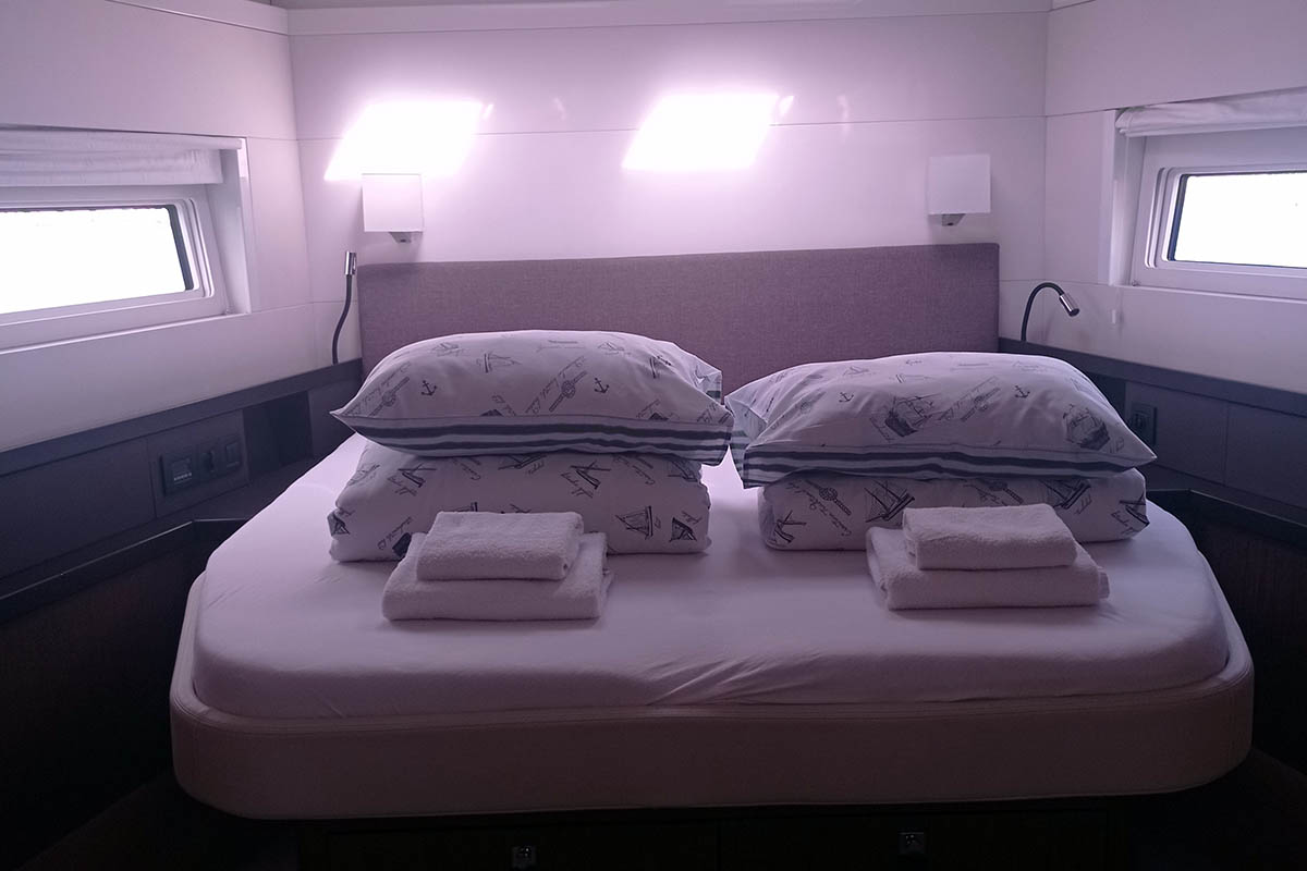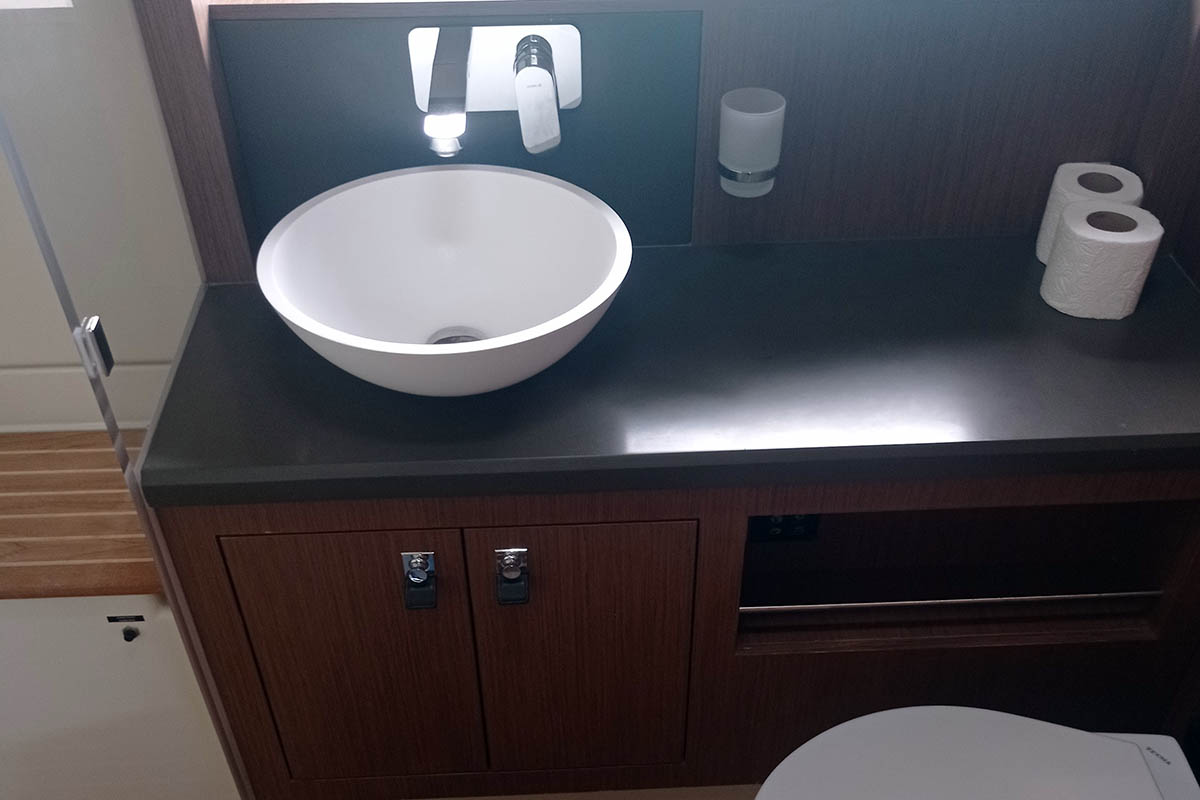 | Inside | 220V sockets, Oven, Ice cube machine, Electrical filter coffee maker, Black water tank, Gas oven, Generator, Dishwasher, Heating, Inverter 12V/220V, Airconditioning (independent from shore power), Cool box, Refrigerator, Battery charger, Speakers in saloon, Microwave oven, Moka pot, Pantry equipment, Radio with MP3, Safe for valuables, Convertible salon table, Toaster, Dryer, TV, Warm water, Washing machine, Kettle, Watermaker, WC (electr.), Wine fridge |