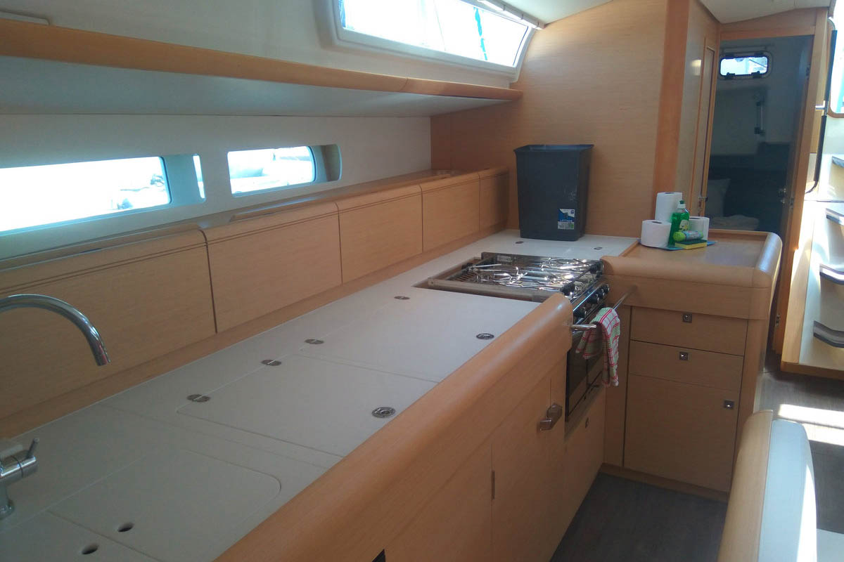 | Inside | 12V/220V sockets, Oven, DVD player, Ice box, Black water tank, Gas oven, Generator, Heating, Airconditioning (independent from shore power), Refrigerator, Battery charger, Speakers in saloon, LED interior lights, Pantry equipment, Radio with CD, MP3, AUX-Input, Kettle |