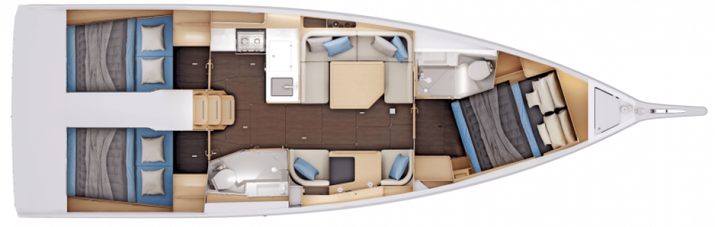 | Safety | Autopilot, First aid kit, Bowthruster, Solid life vests, Fire extinguisher, Distress signals, Life raft, Safety belt, VHF Radio, Second anchor |