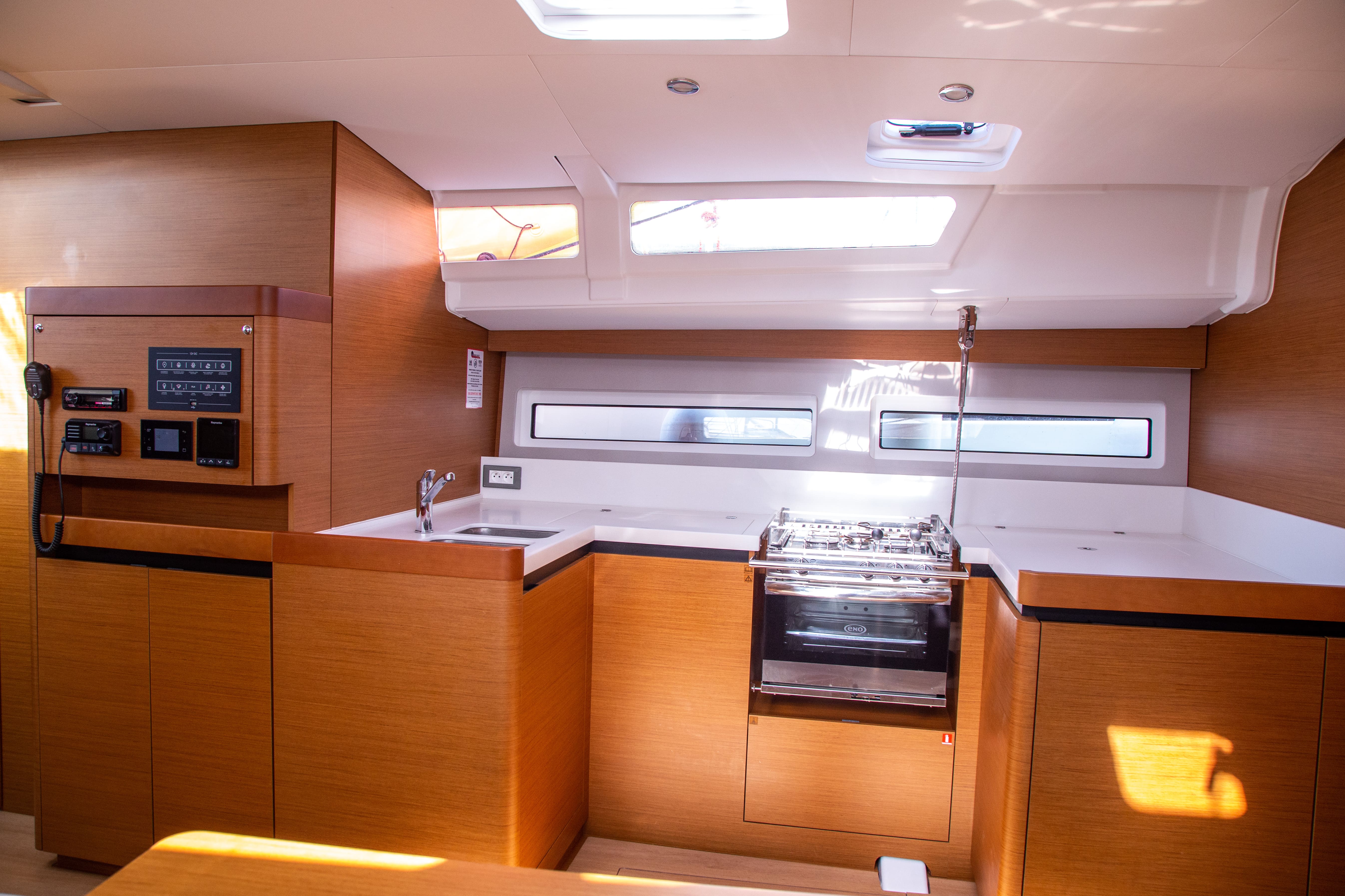 | Inside | Oven, Black water tank, Gas oven, Refrigerator, Battery charger, Shore power cable, Pantry equipment, Radio with MP3, Convertible salon table, USB sockets in the cabins, Cabin & dining area fan |