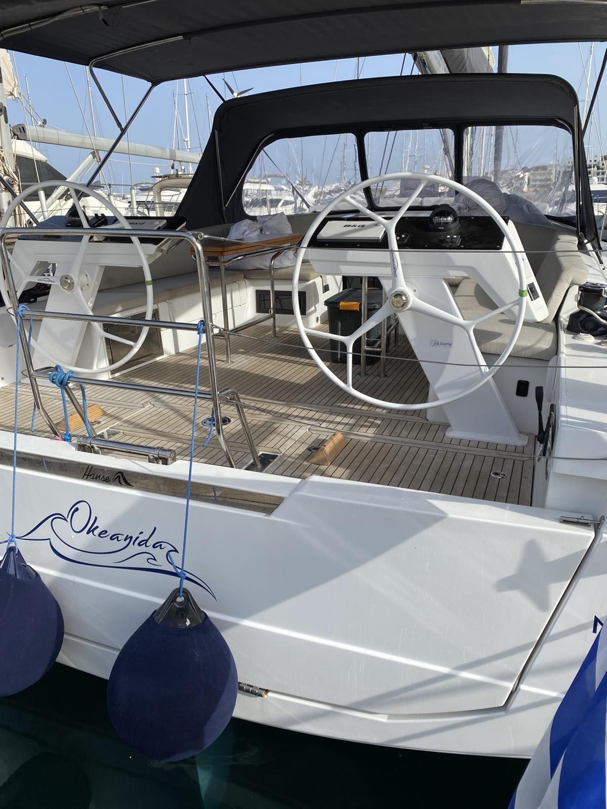 | Outside | 12V - connection, Anchor with chain, cockpit bench convertible to sun lounger, Cockpit shower, Cockpit speakers, Cockpit cushions, Cockpit table, Electr. anchor windlass, electr. winch, Snorkeling gear, Solar panels, Sprayhood, Teak in cockpit, LED submarine lights, Windex |