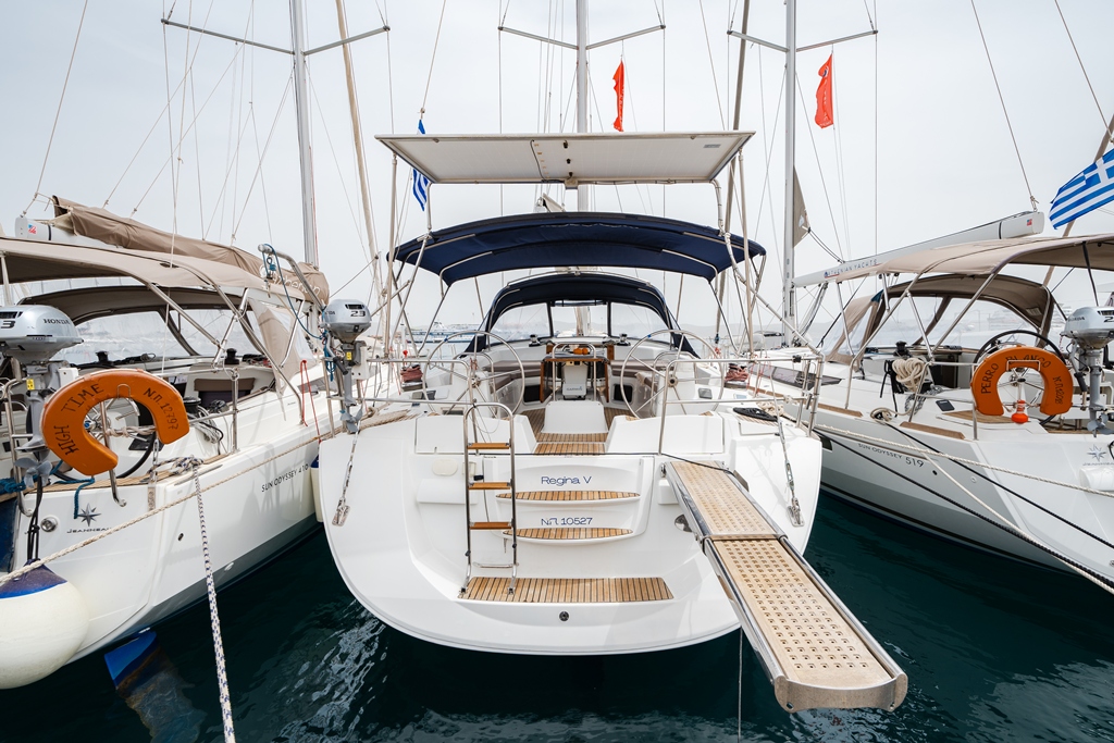 | Outside | 220V shore connection, Bathing ladder, Bimini top, Cockpit shower, Cockpit cushions, Cockpit table, Electr. anchor windlass, electr. winch, hydraul. Gangway, Snorkeling gear, Solar panels, Sprayhood |