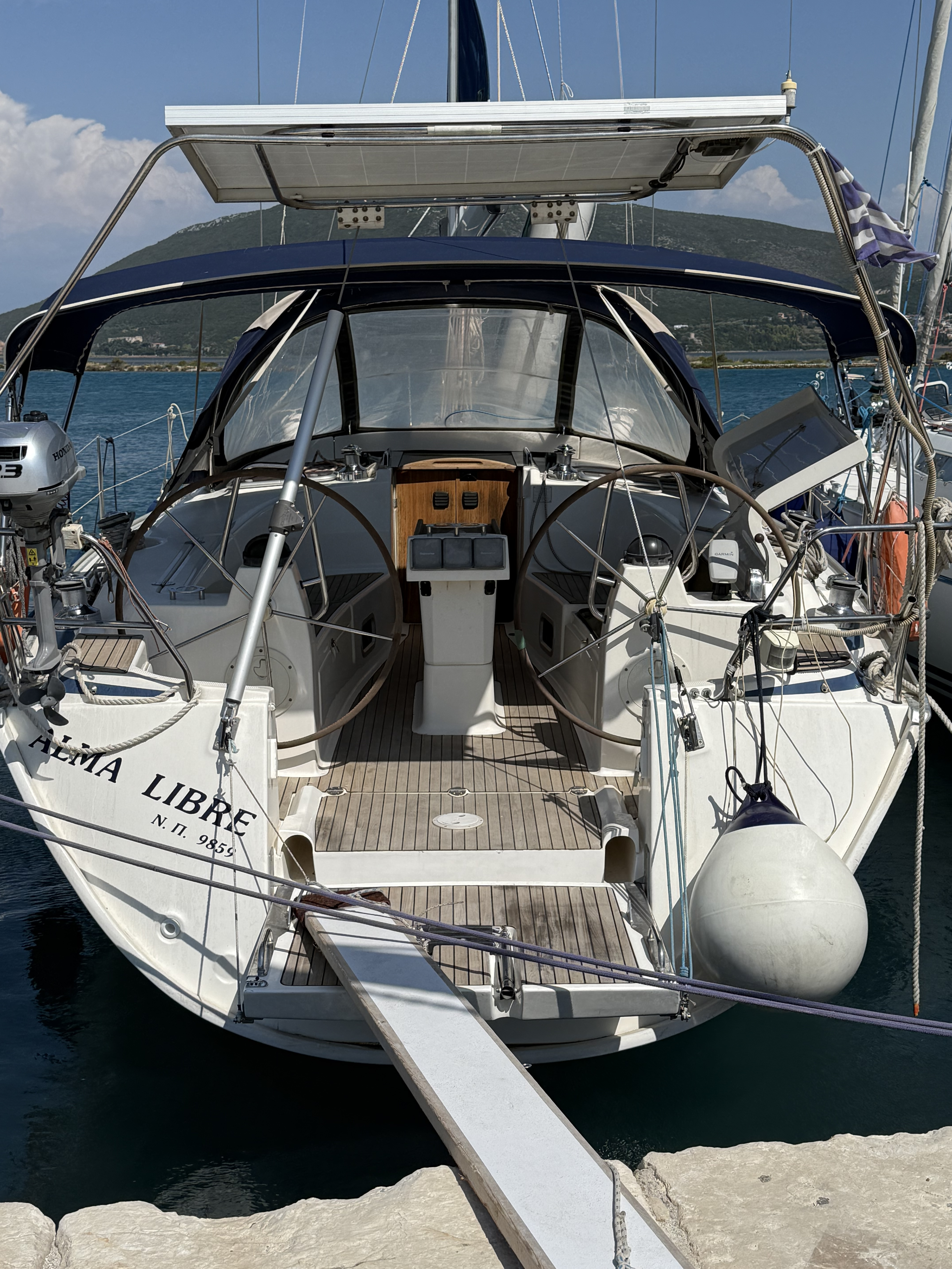 Großartig war das Solarpaneel mit den Lithiumbatterien, keinerlei Sorgen wegen Strom, ansonsten war die Yacht dem Alter entsprechend, gut gepflegt mit vielen nützlichen Hacken und Kleinigkeiten, außerdem ca 100m Kette und 2 lange, schwimmende Landleinen. Nur die Leiter auf der Badeplattform war etwas kniffelig. Insgesamt sehr gutes Boot.