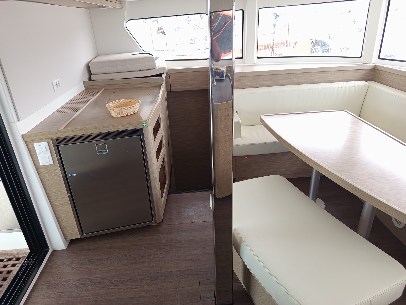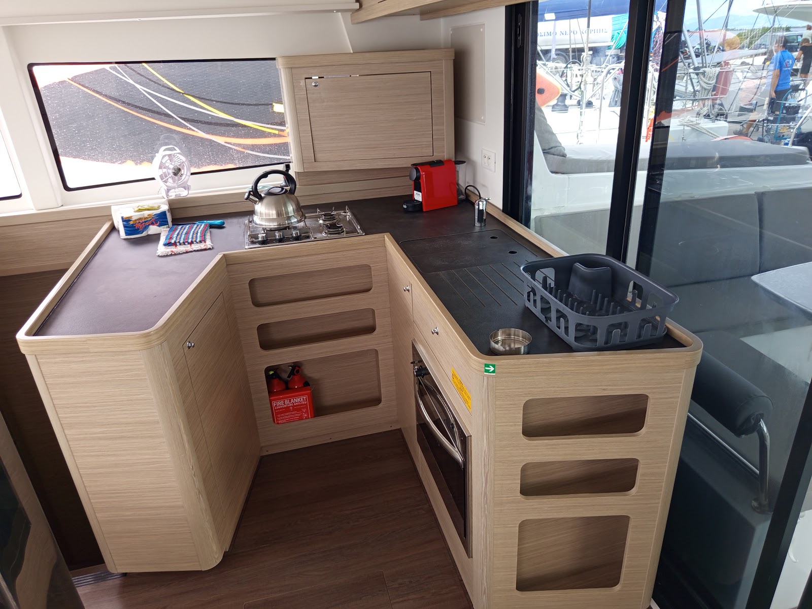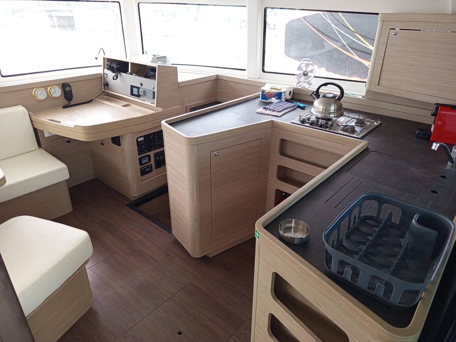 | Inside | Gas oven, Generator, Inverter 12V/220V, Coffee machine, Airconditioning (independent from shore power), Refrigerator, Radio with USB and Bluetooth, USB sockets in the cabins, fans in cabins, Watermaker, WC (electr.) |