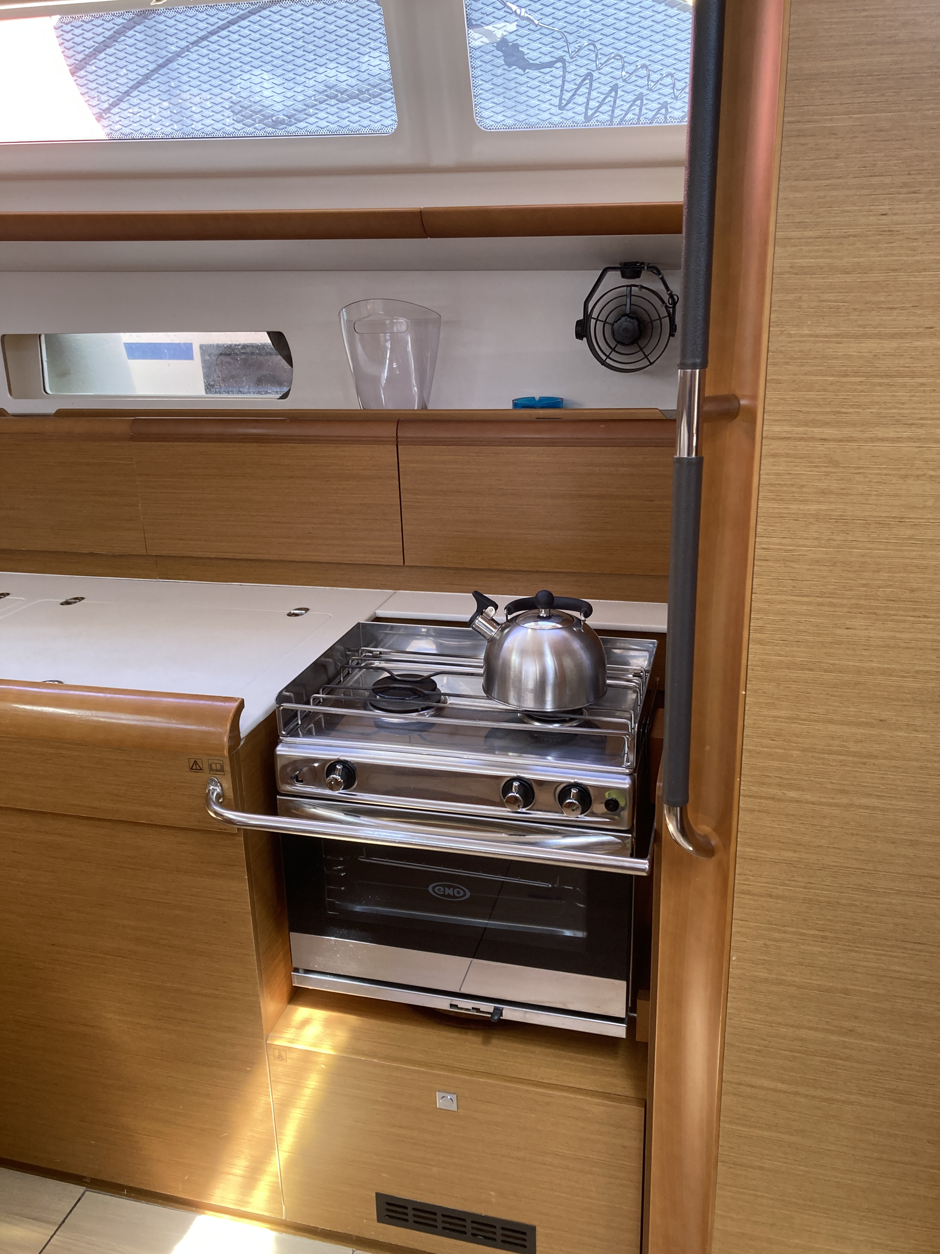 | Inside | Oven, Freezer, Refrigerator, Battery charger, Shore power cable, Pantry equipment, Radio with CD/MP3/USB, Convertible salon table, fans in cabins, Warm water, Toilet |