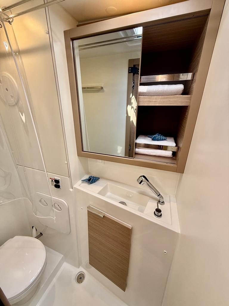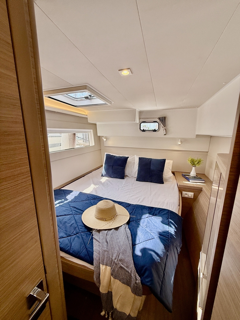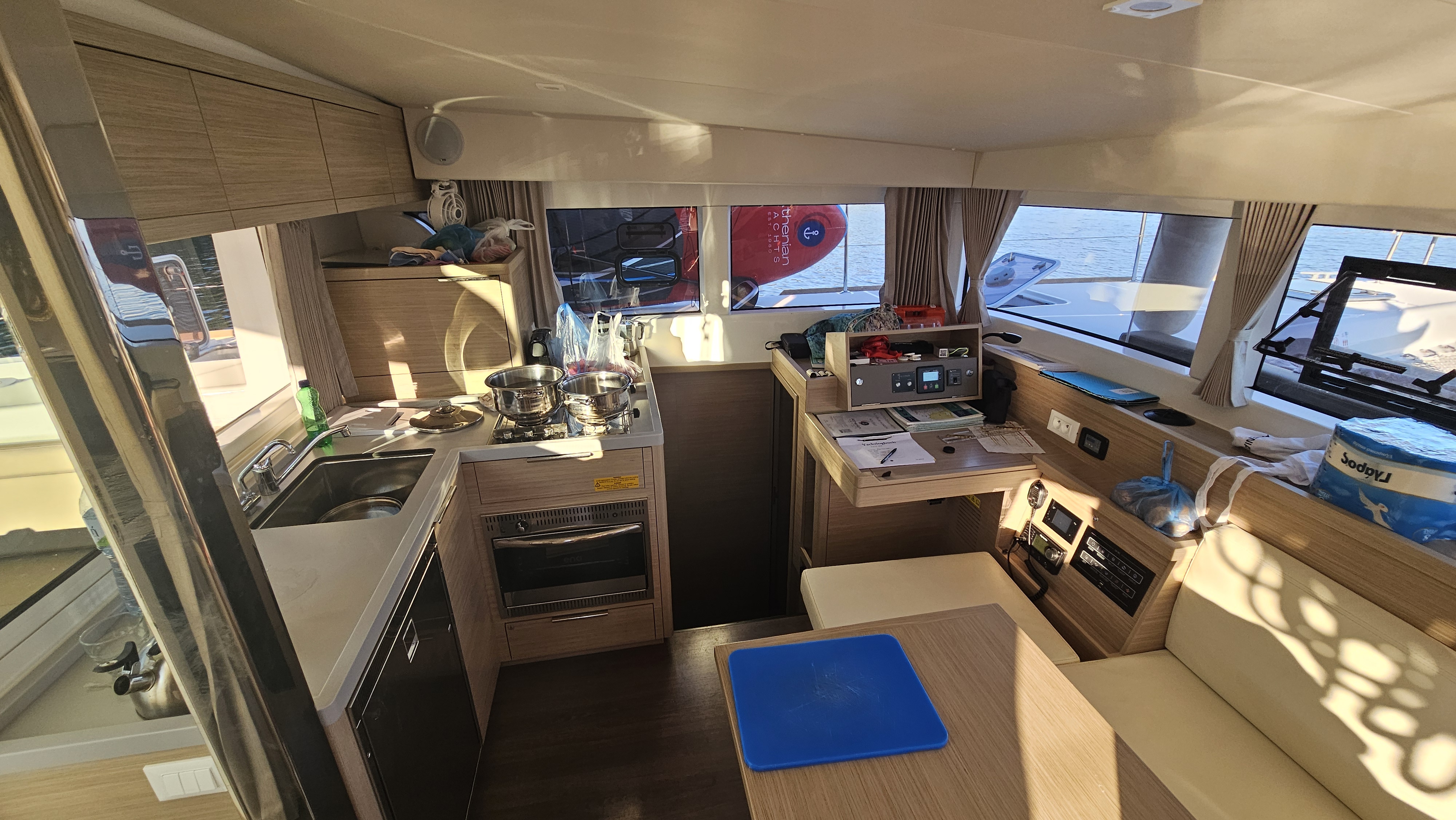| Inside | 220V sockets, Oven, Electric hob, Black water tank, Gas oven, Freezer, Generator, Inverter 12V/220V, Airconditioning (independent from shore power), Refrigerator, Battery charger, Shore power cable, Convertible salon table, USB Socket, Cabin & dining area fan , Warm water, Watermaker, WC (electr.) |