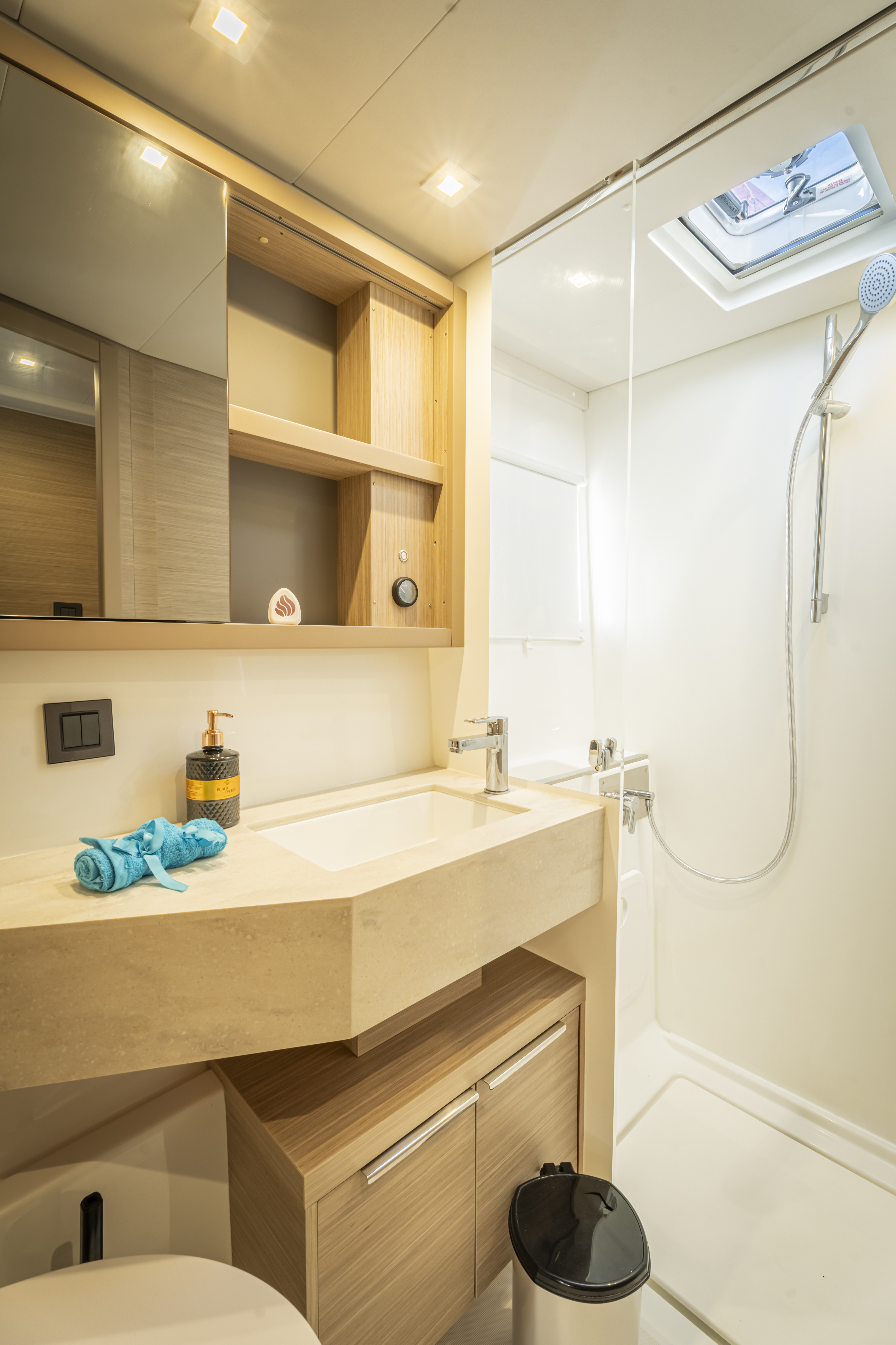 | Inside | Oven, Black water tank, Gas oven, Freezer, Generator, Inverter 12V/220V, Airconditioning (independent from shore power), fridge and freezer, Battery charger, Shore power cable, Radio with CD and MP3, Cabin & dining area fan , Watermaker, WC (electr.) |