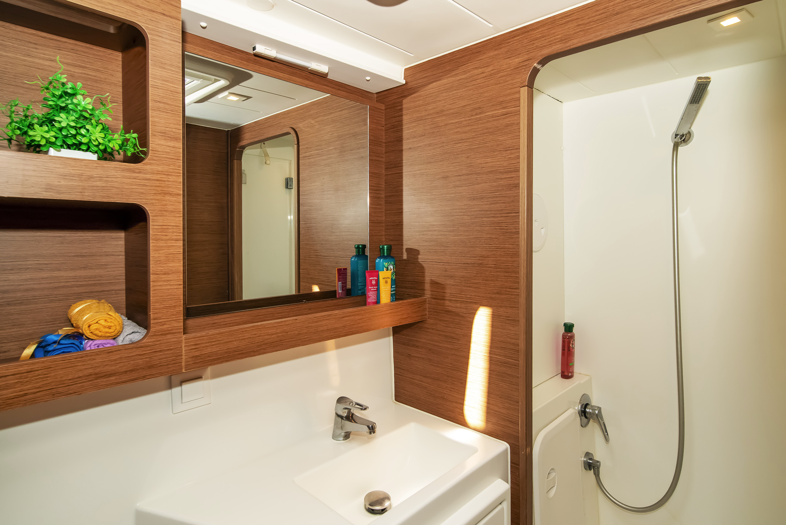 | Inside | Generator, Airconditioning (independent from shore power), Pantry equipment, Radio, fans in cabins, WC (electr.) |