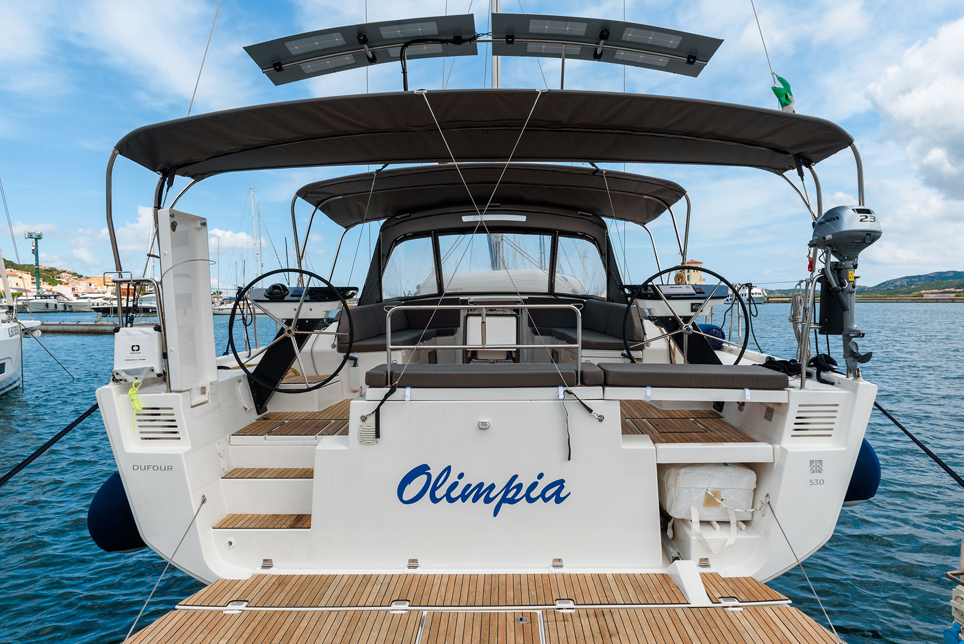 | Outside | 220V shore connection, Bathing platform, Bimini top, Cockpit shower, Cockpit cushions, Cockpit table, Electr. anchor windlass, BBQ, Solar panels, Sprayhood |