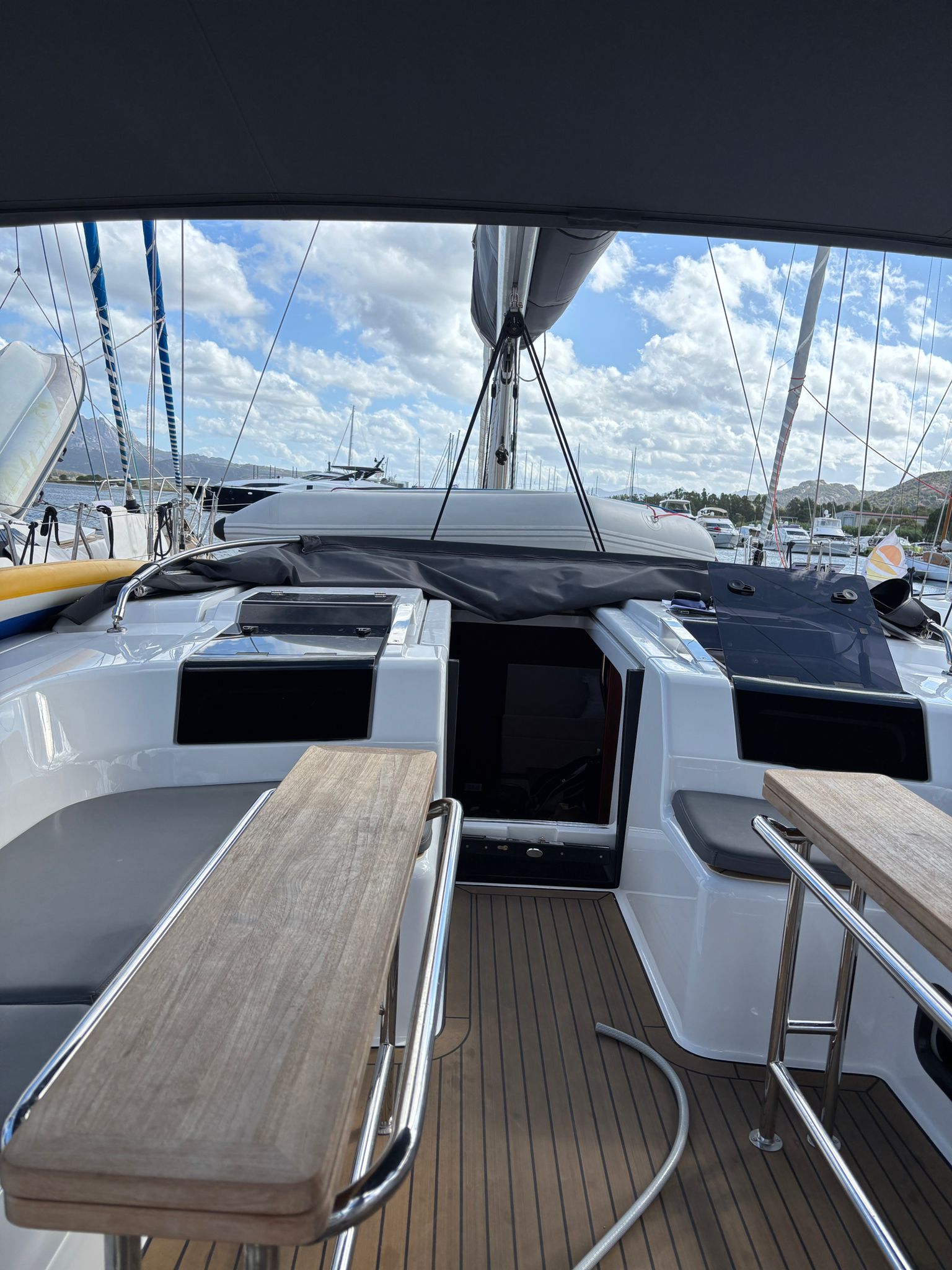 | Outside | 220V shore connection, Bathing platform, Bimini top, Cockpit shower, Cockpit cushions, Cockpit table, Electr. anchor windlass, electr. winch, BBQ, Solar panels, Sprayhood, Sink on cockpit , Teak in cockpit, Wet bar |