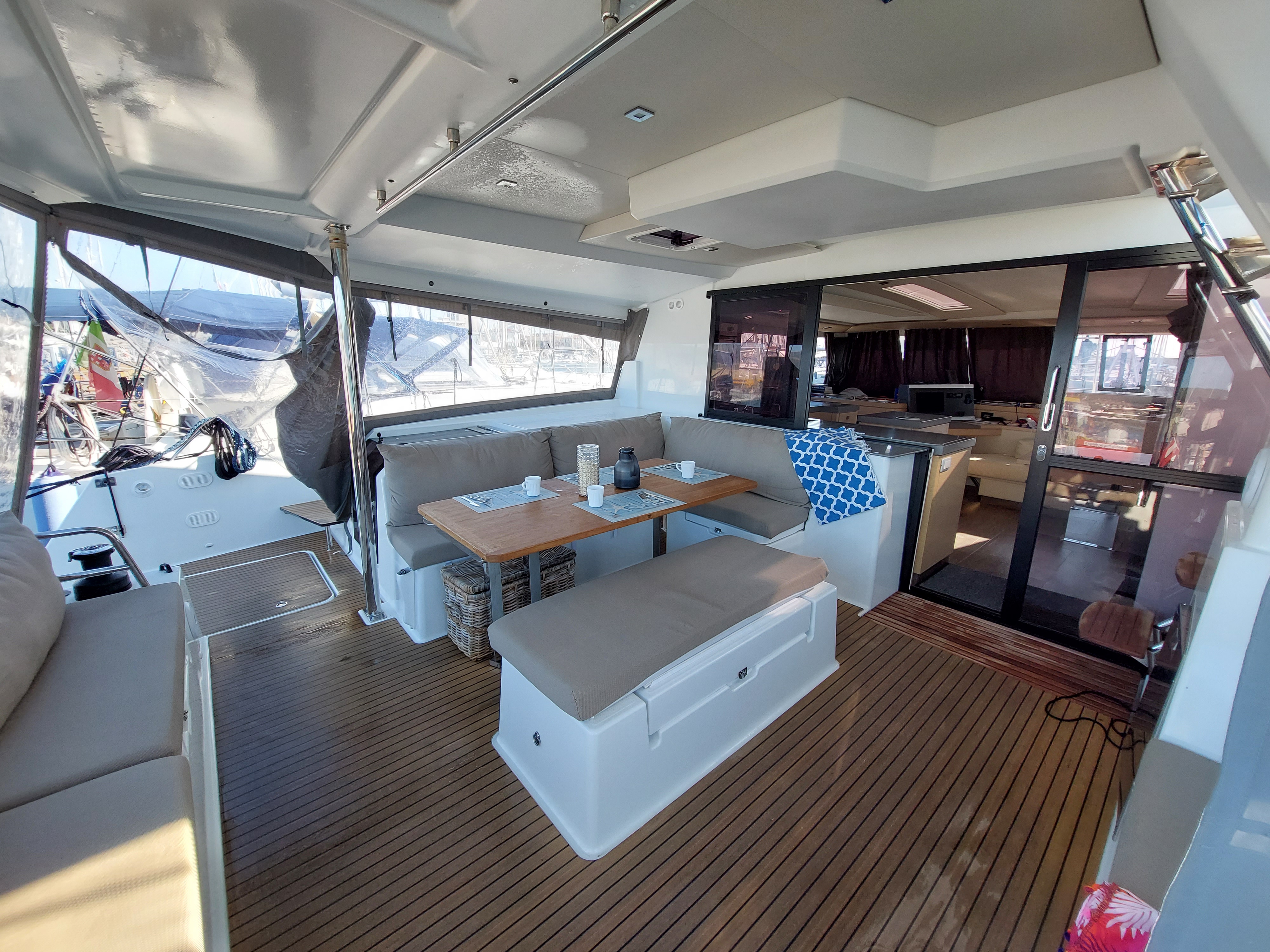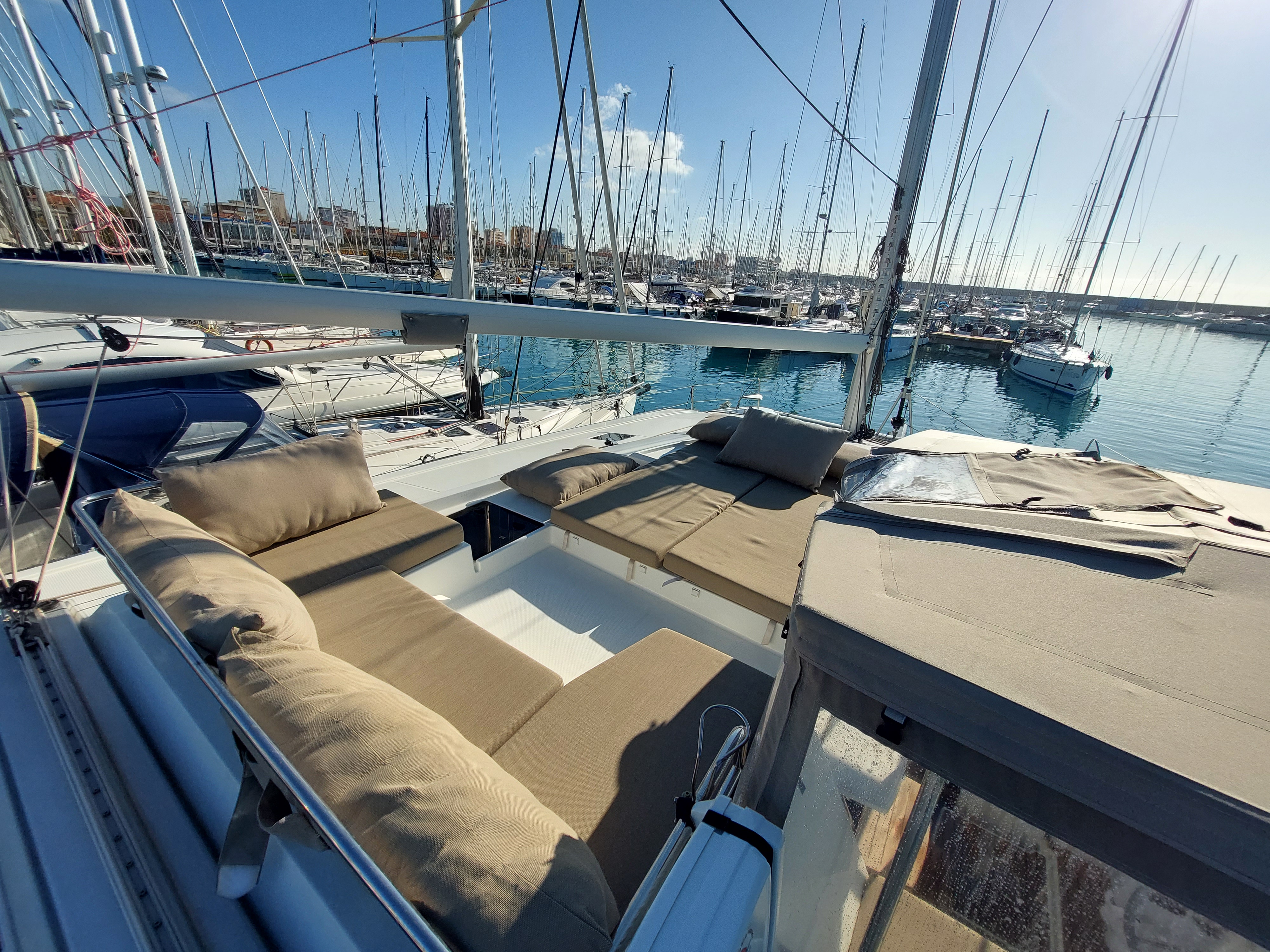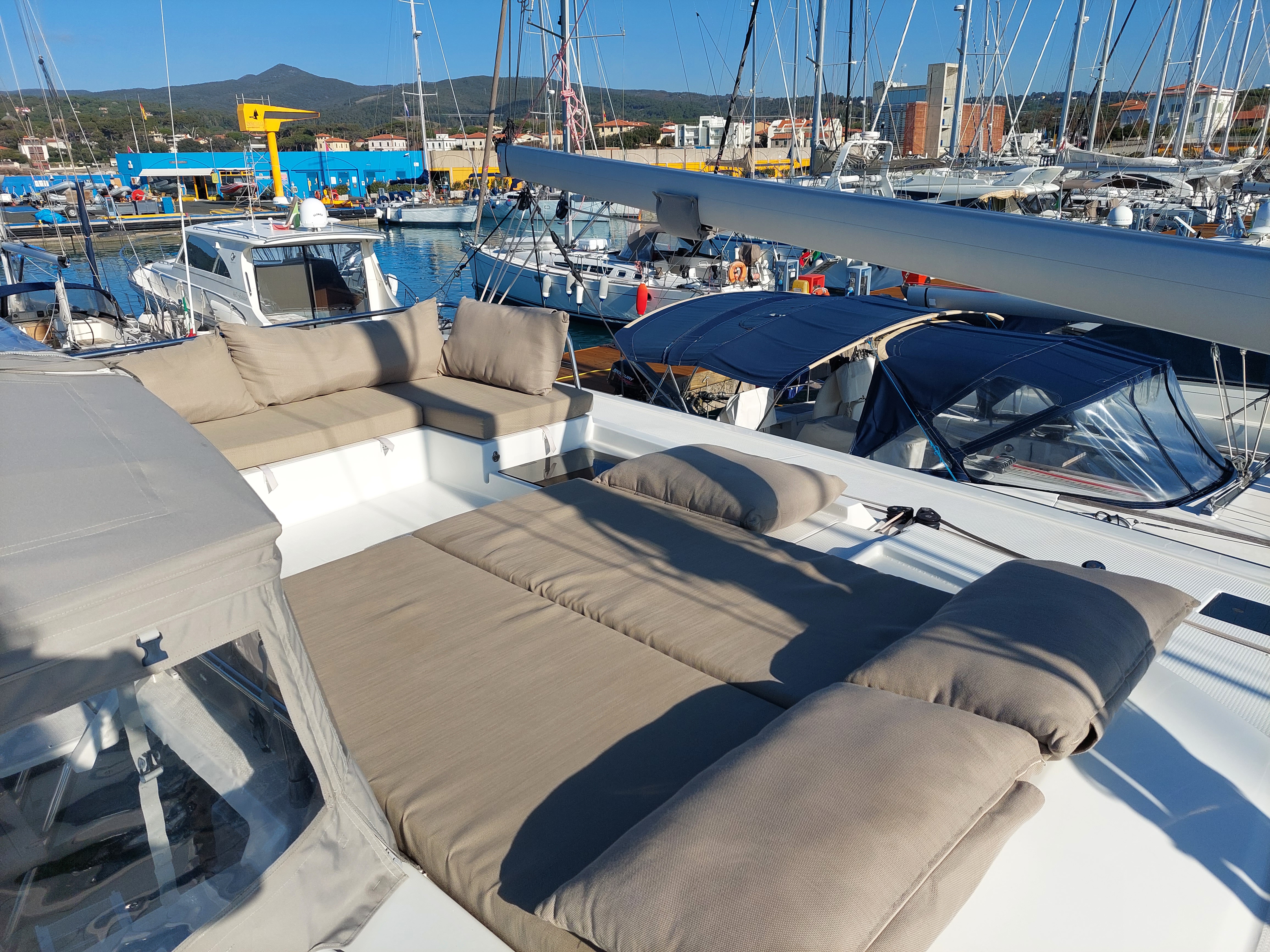 | Outside | Bathing platform, Bimini top, Cockpit speakers, Cockpit cushions, Cockpit table, Deck cushions, Electr. anchor windlass, Solar panels, Sprayhood |