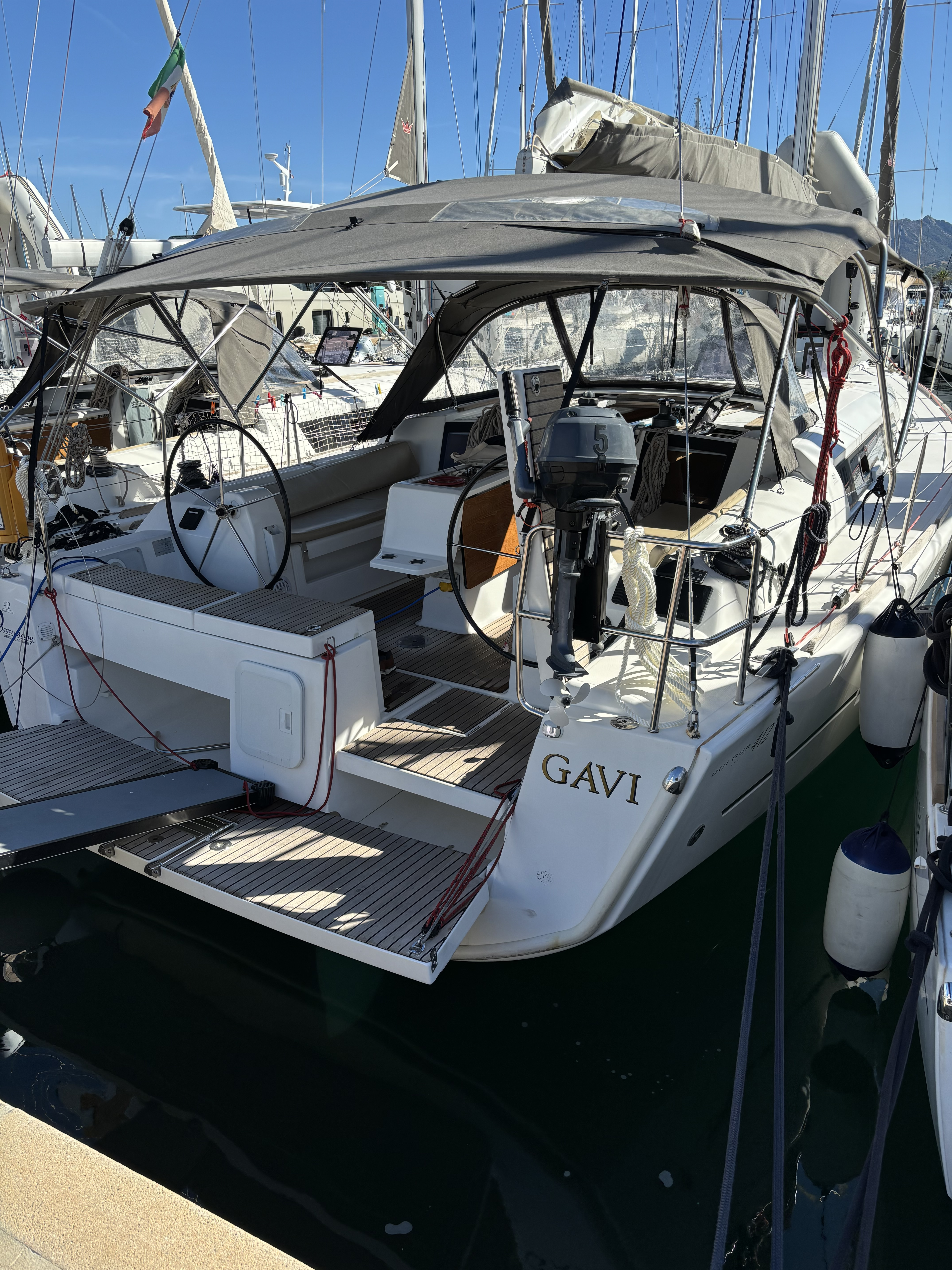 | Outside | Anchor with chain, Bimini top, Boat hook, Brush and sponge, Cockpit shower, Cockpit speakers, Cockpit light, Cockpit table, Deck cushions, Electr. anchor windlass, electr. winch, Fender, Mooring lines, Gangway, BBQ, Hardtop, Snorkeling gear, Sprayhood, Teak in cockpit, Water hose, Windex |