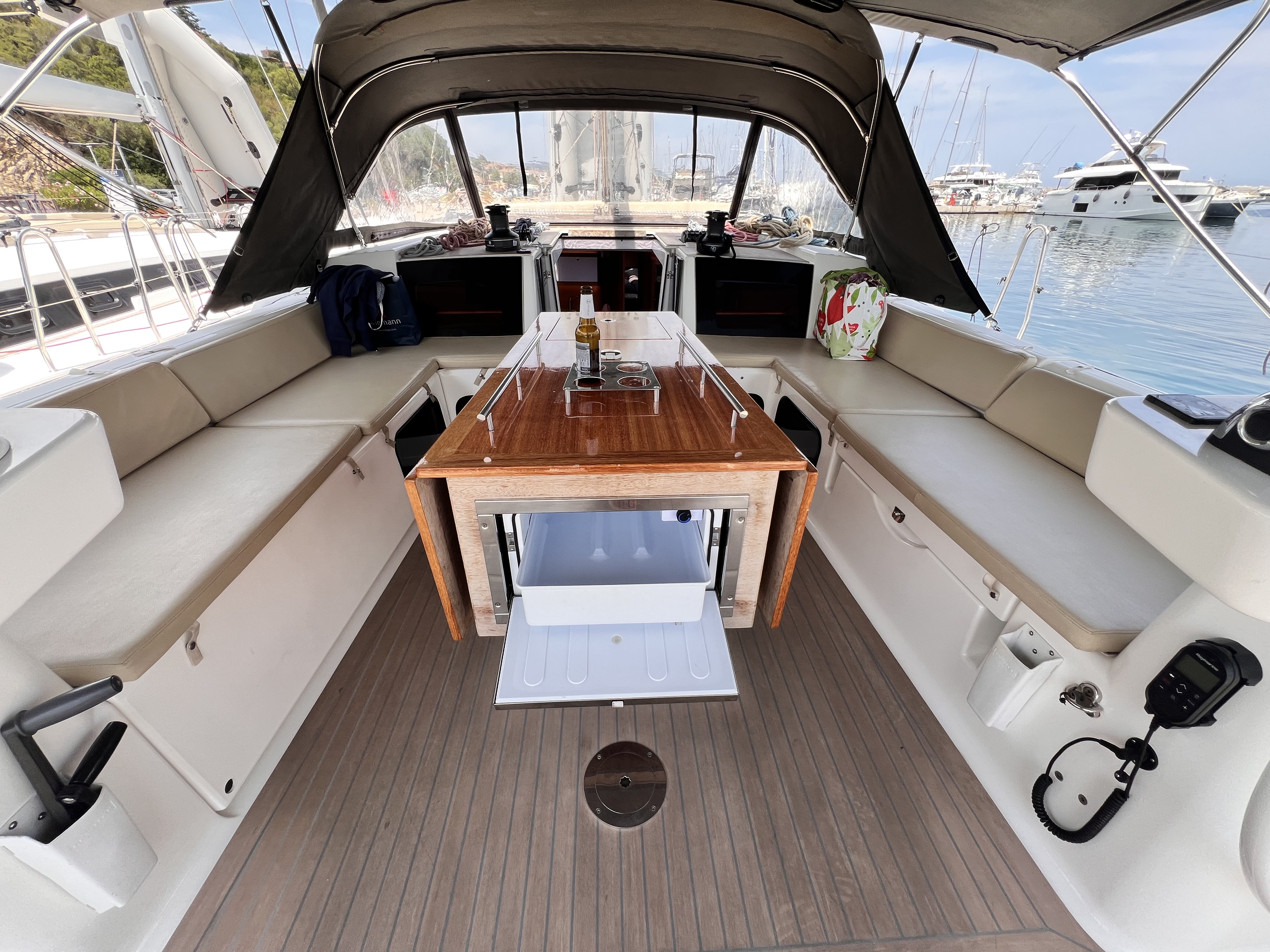 | Outside | Anchor with chain, Outside shower, Bathing platform, Bimini top, Boat hook, Brush and sponge, Cockpit speakers, Cockpit light, Cockpit table, Deck cushions, Electr. anchor windlass, electr. winch, Fender, Mooring lines, Gangway, BBQ, Hardtop, Snorkeling gear, Sprayhood, Water hose, Windex |