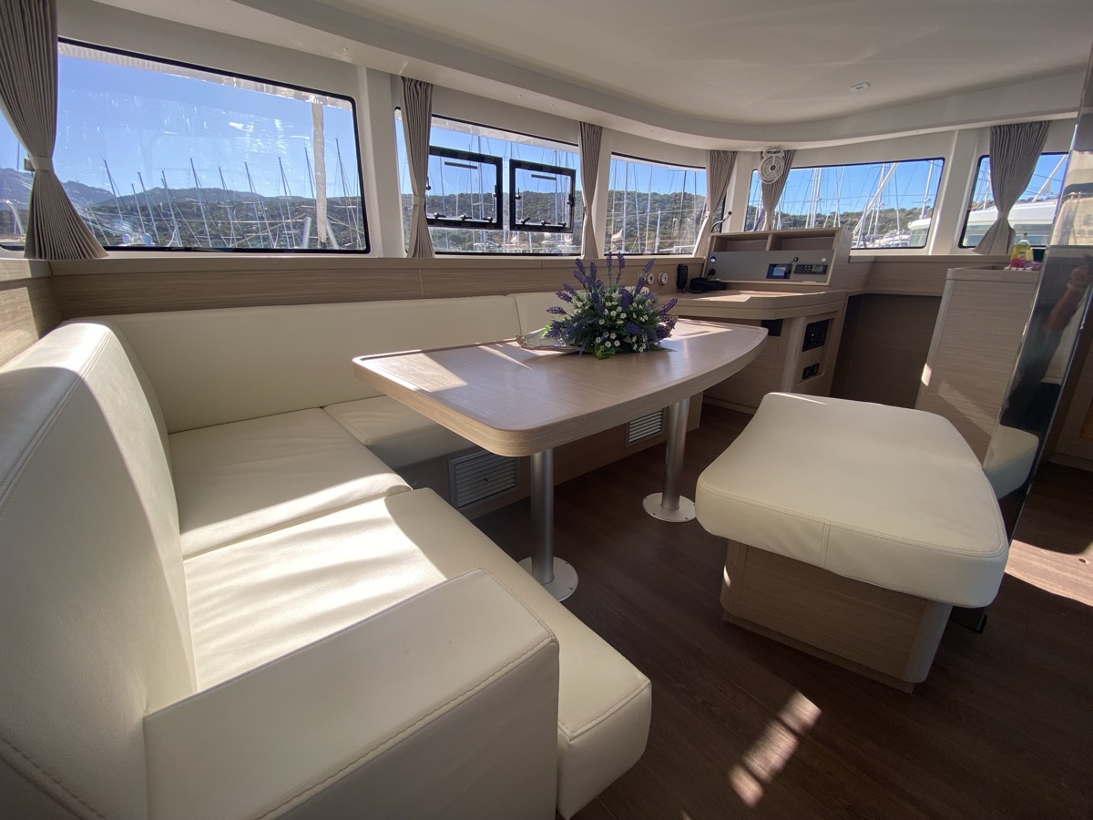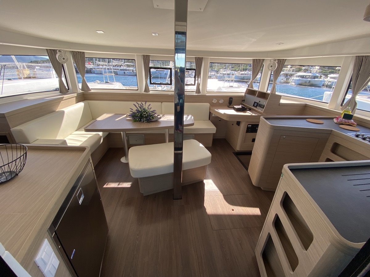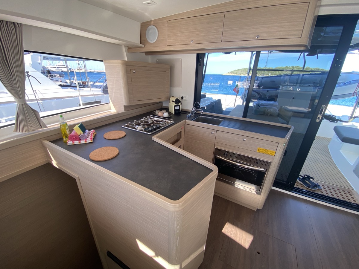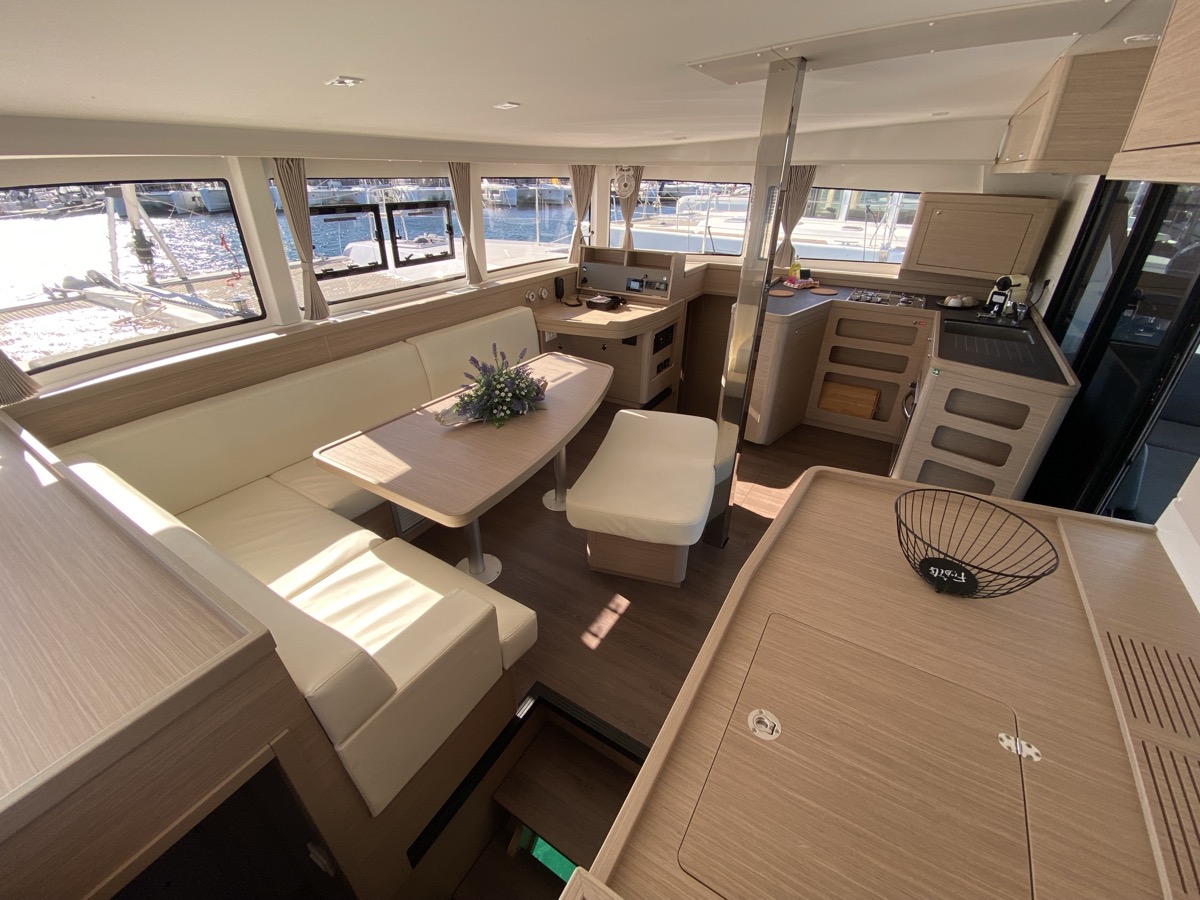 | Inside | Oven, Inverter 12V/220V, Coffee machine, Dock A/C 220V (cool&heat), Shore power cable, Moka pot, Pantry equipment, Radio, Convertible salon table, USB sockets in the cabins, Fan, fans in cabins, Warm water, Watermaker, WC (electr.), Inverter |
