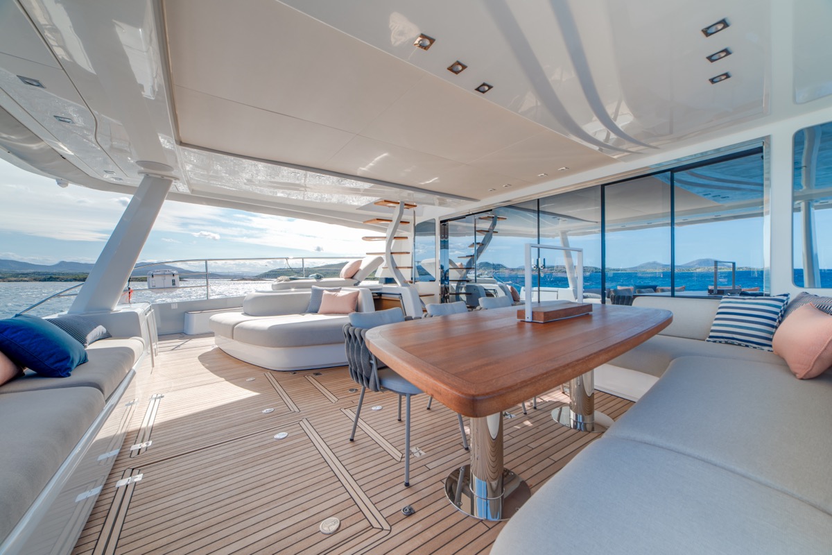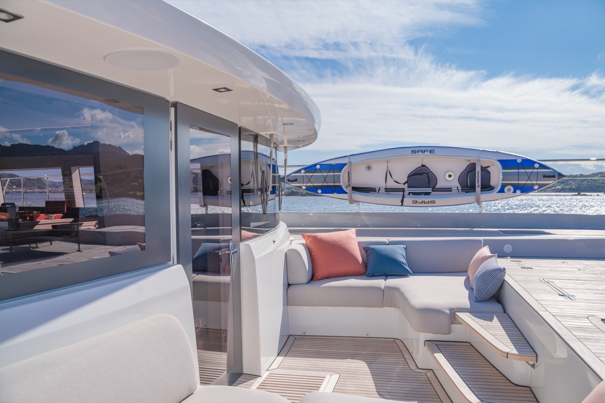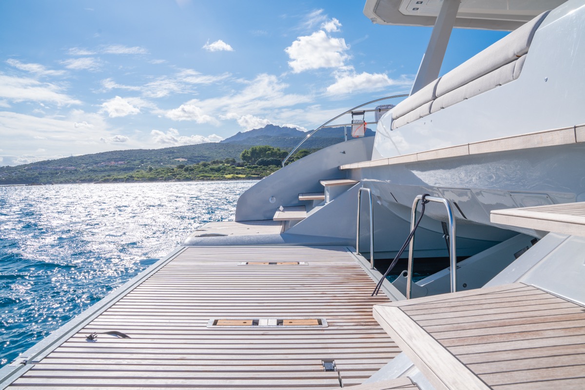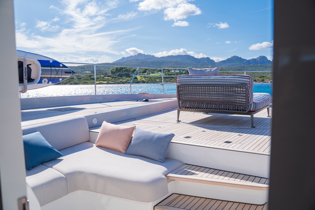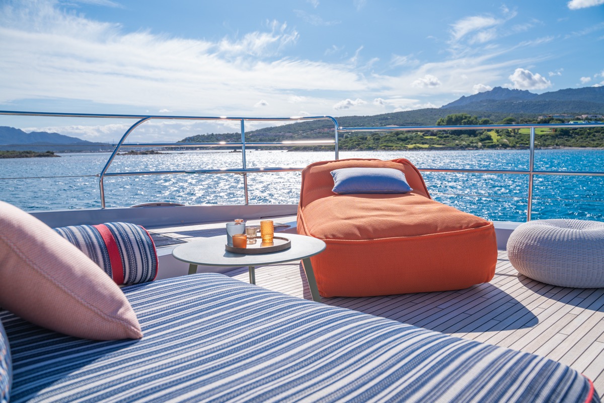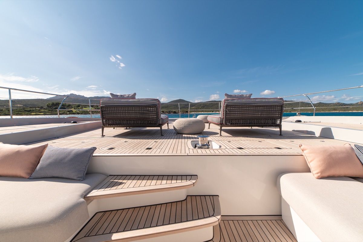 | Outside | Bathing platform, Bimini top, Cockpit shower, Refrigerator in cockpit, Cockpit speakers, Cockpit cushions, Cockpit table, Deck cushions, Mooring lines, Flybridge, hydraul. Gangway, Snorkeling gear, Teak in cockpit, Teak deck, Dinghy hydraulic lifting system |