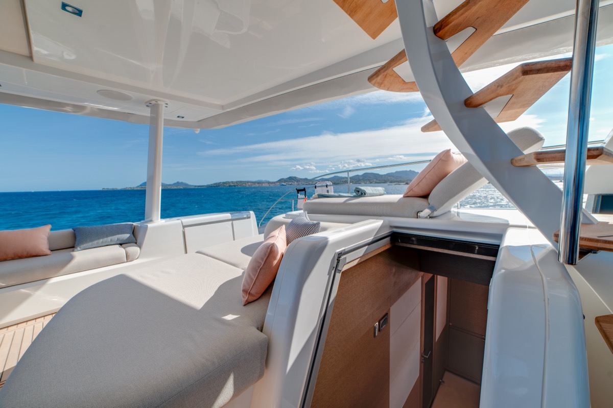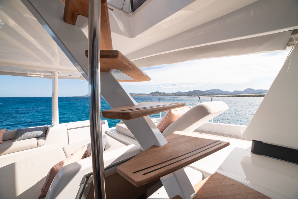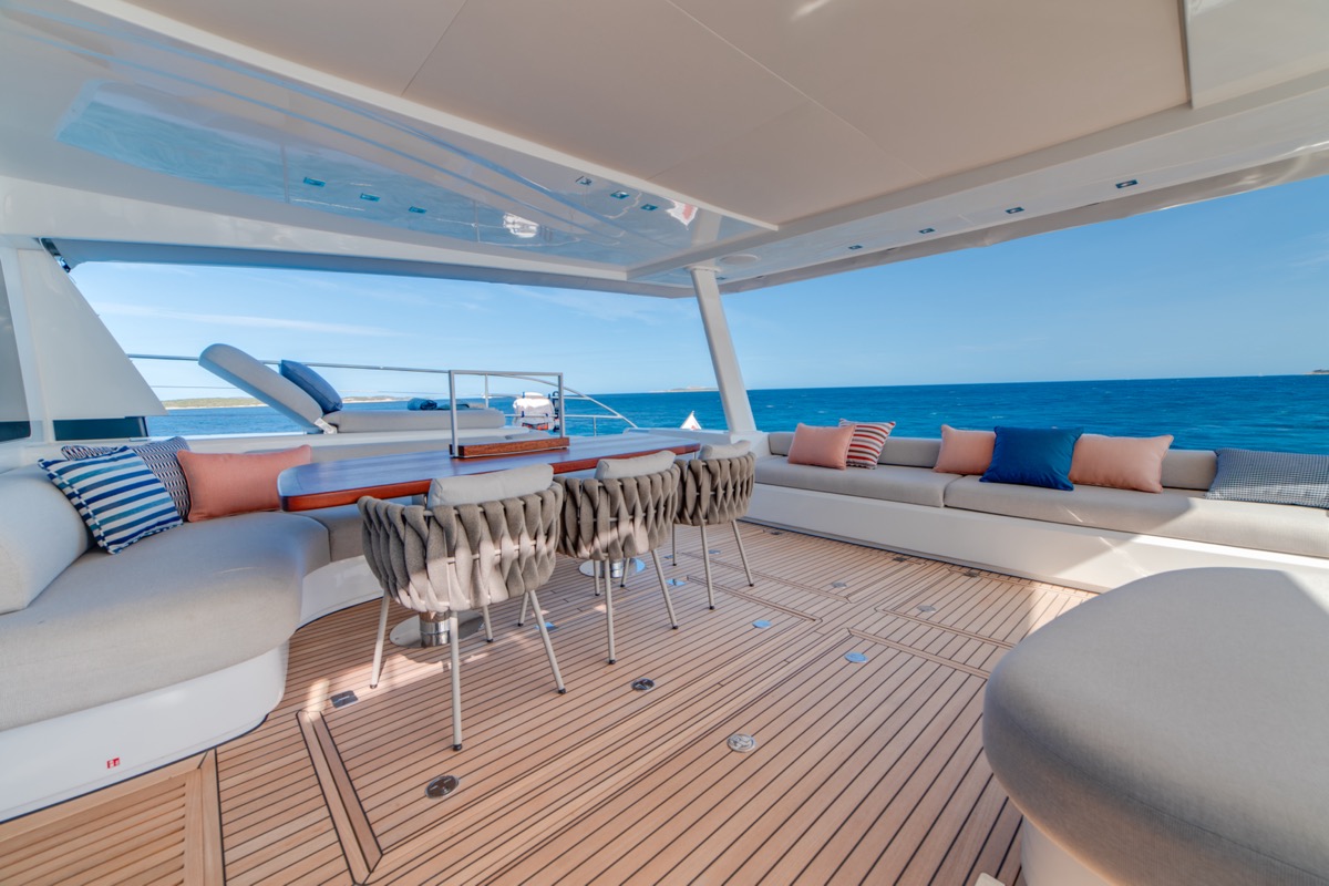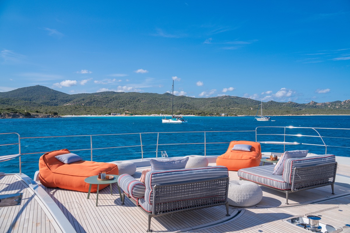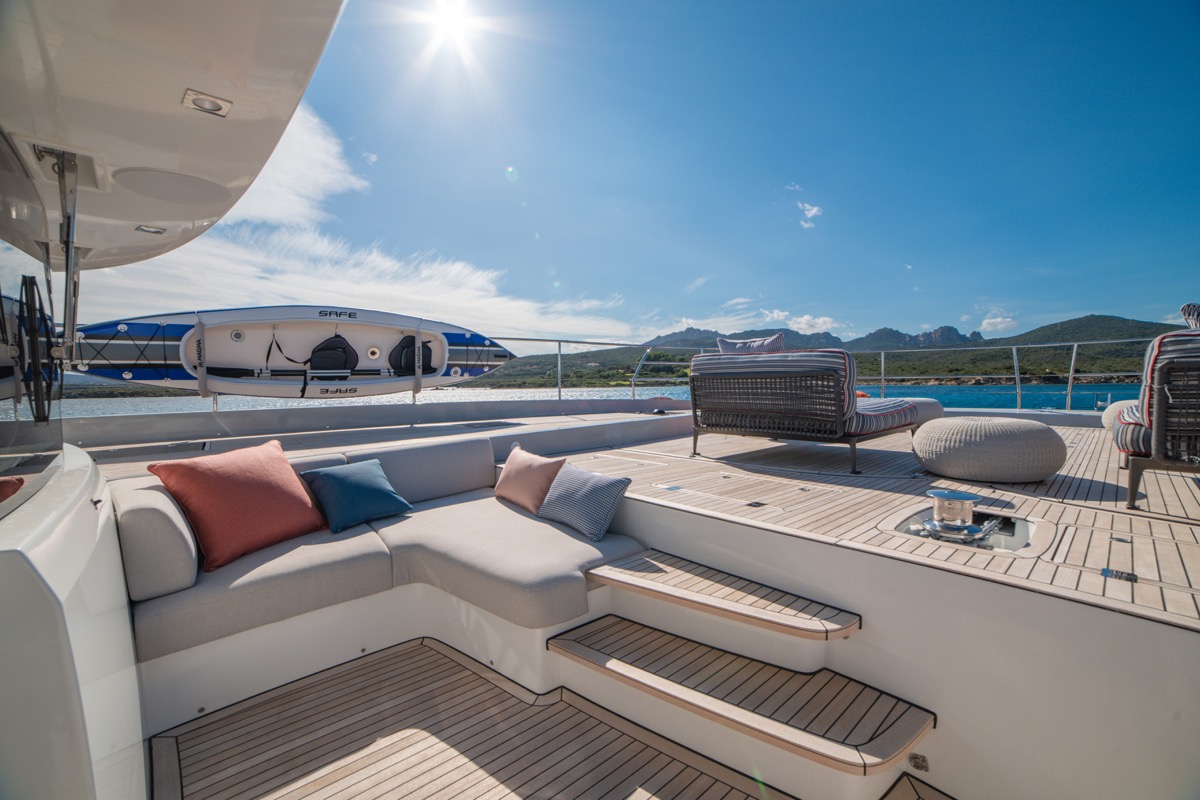 | Outside | Bathing platform, Bimini top, Cockpit shower, Refrigerator in cockpit, Cockpit speakers, Cockpit cushions, Cockpit table, Deck cushions, Mooring lines, Flybridge, hydraul. Gangway, Snorkeling gear, Teak in cockpit, Teak deck, Dinghy hydraulic lifting system |