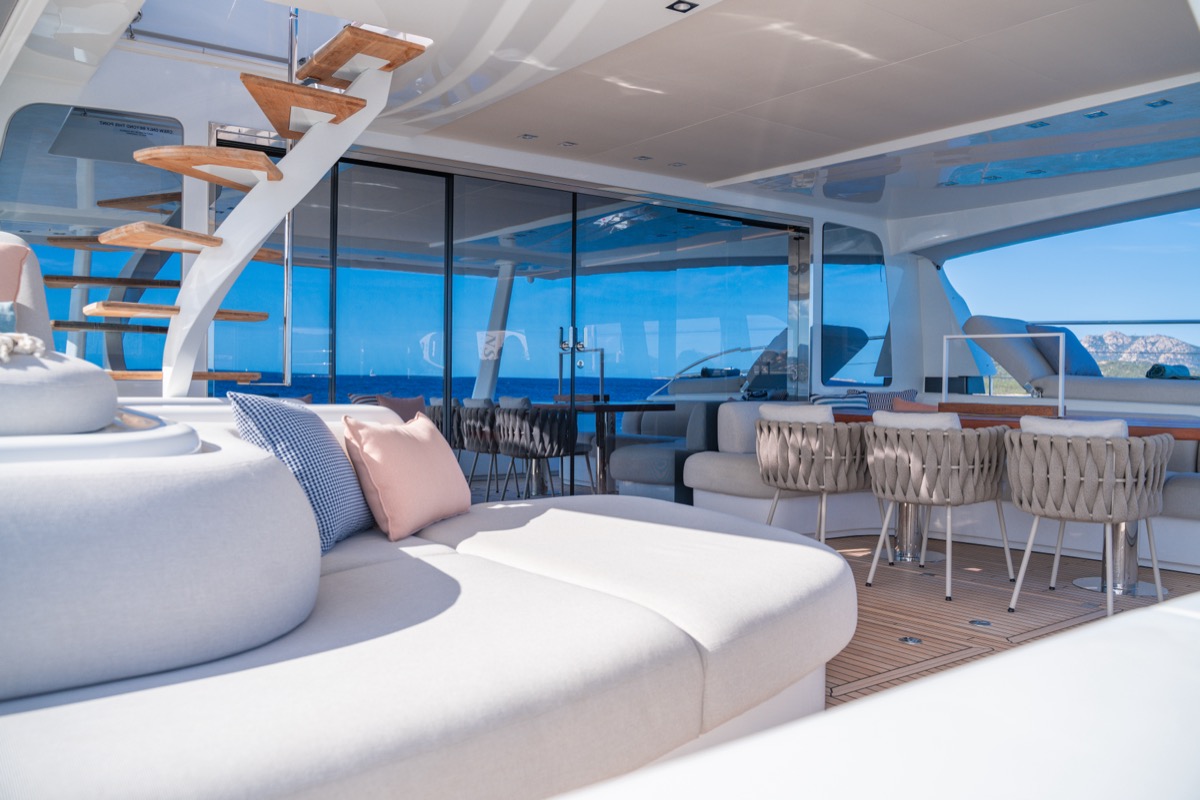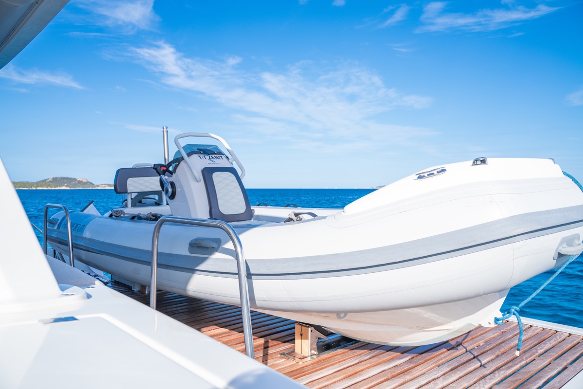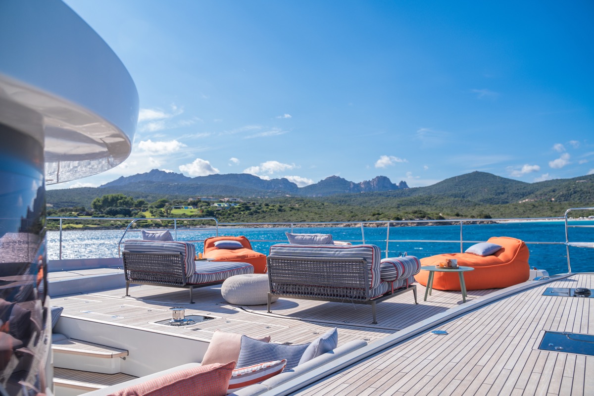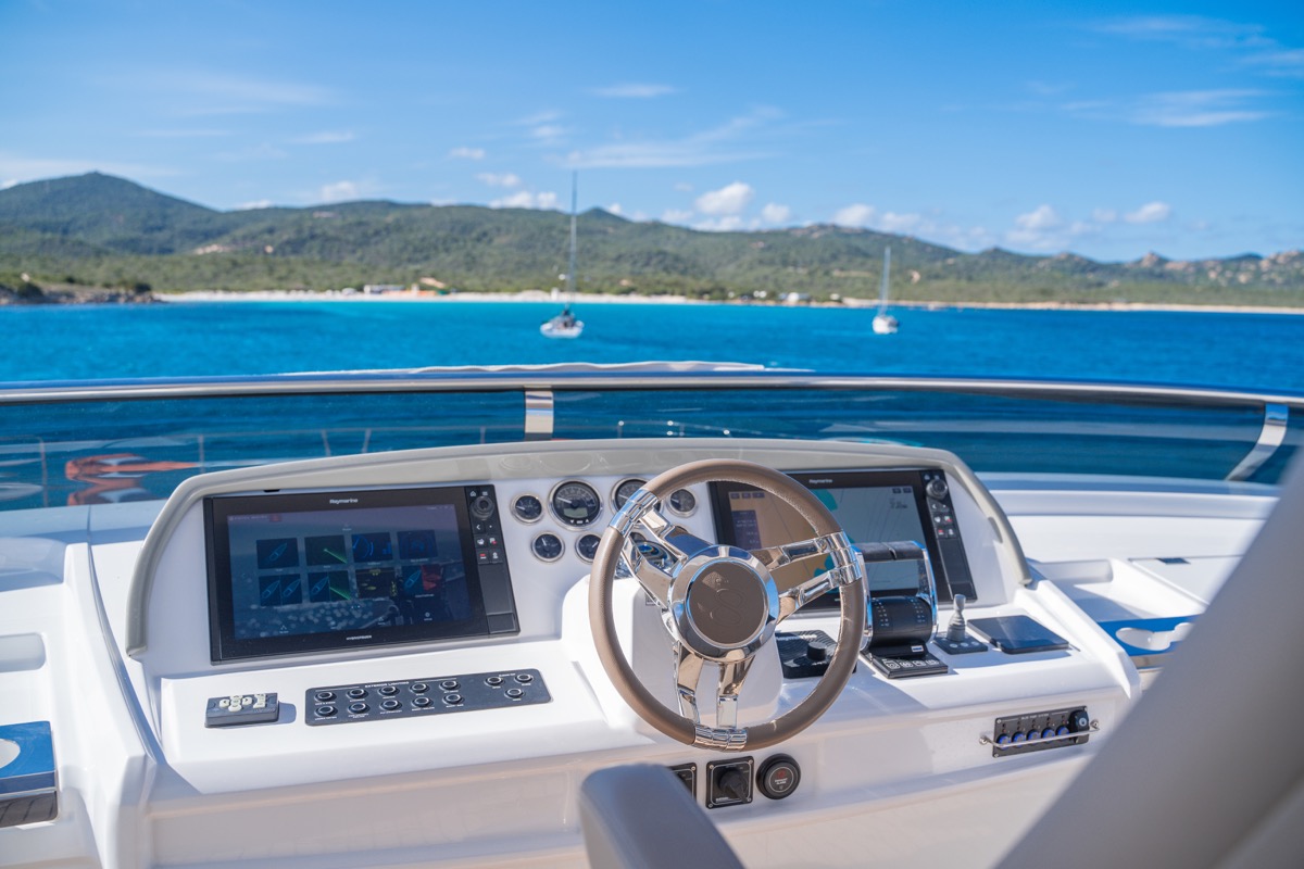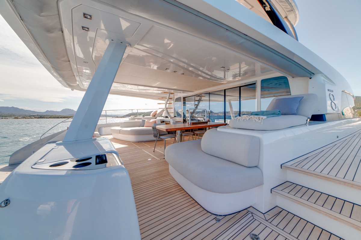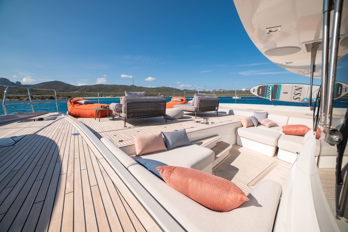 | Outside | Bathing platform, Bimini top, Cockpit shower, Refrigerator in cockpit, Cockpit speakers, Cockpit cushions, Cockpit table, Deck cushions, Mooring lines, Flybridge, hydraul. Gangway, Snorkeling gear, Teak in cockpit, Teak deck, Dinghy hydraulic lifting system |