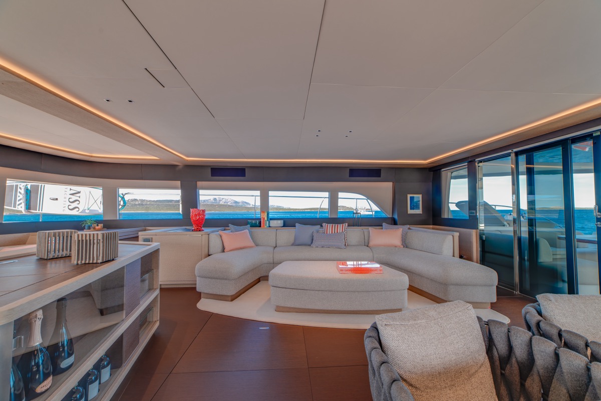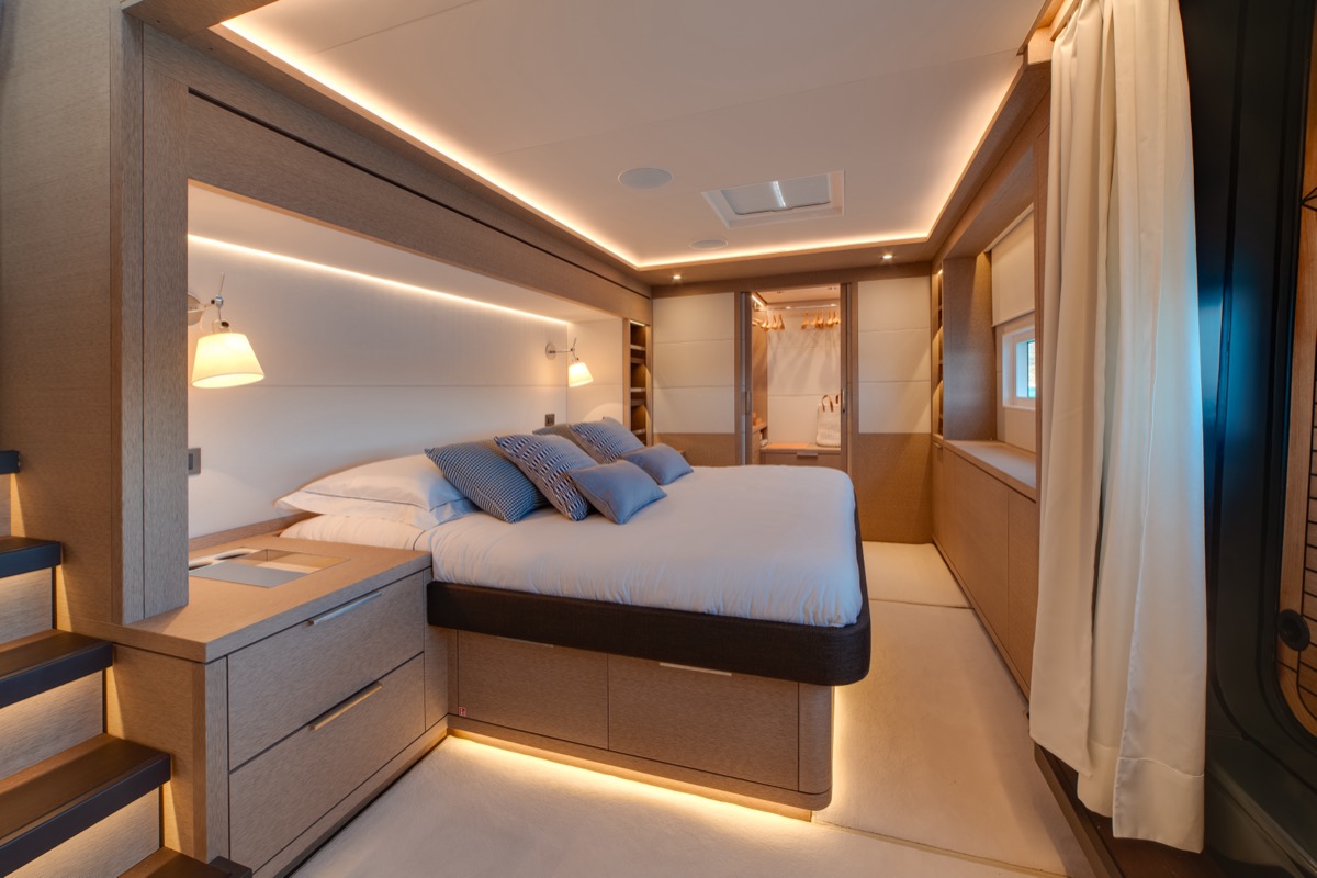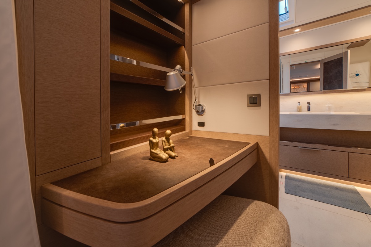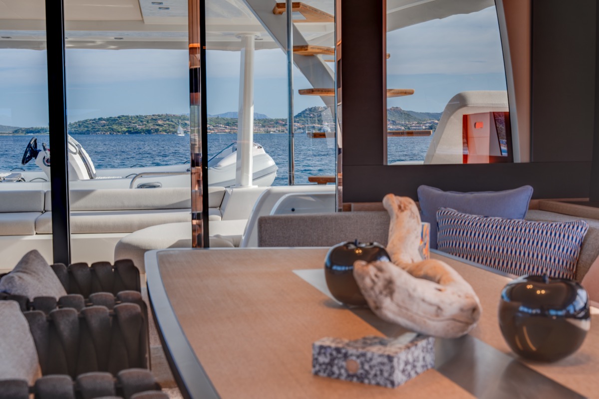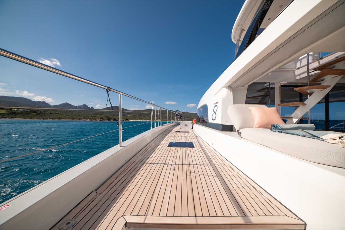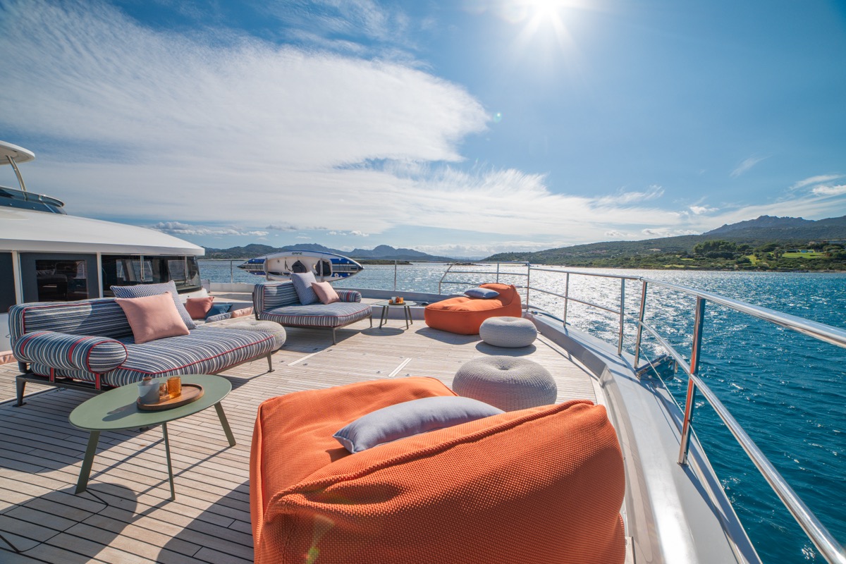 | Outside | Bathing platform, Bimini top, Cockpit shower, Refrigerator in cockpit, Cockpit speakers, Cockpit cushions, Cockpit table, Deck cushions, Mooring lines, Flybridge, hydraul. Gangway, Snorkeling gear, Teak in cockpit, Teak deck, Dinghy hydraulic lifting system |