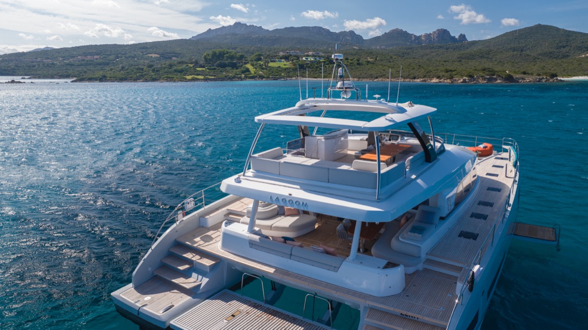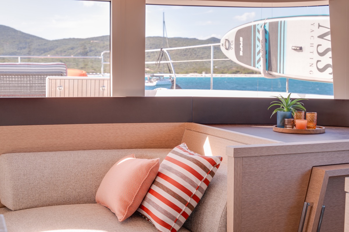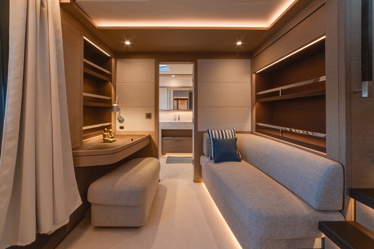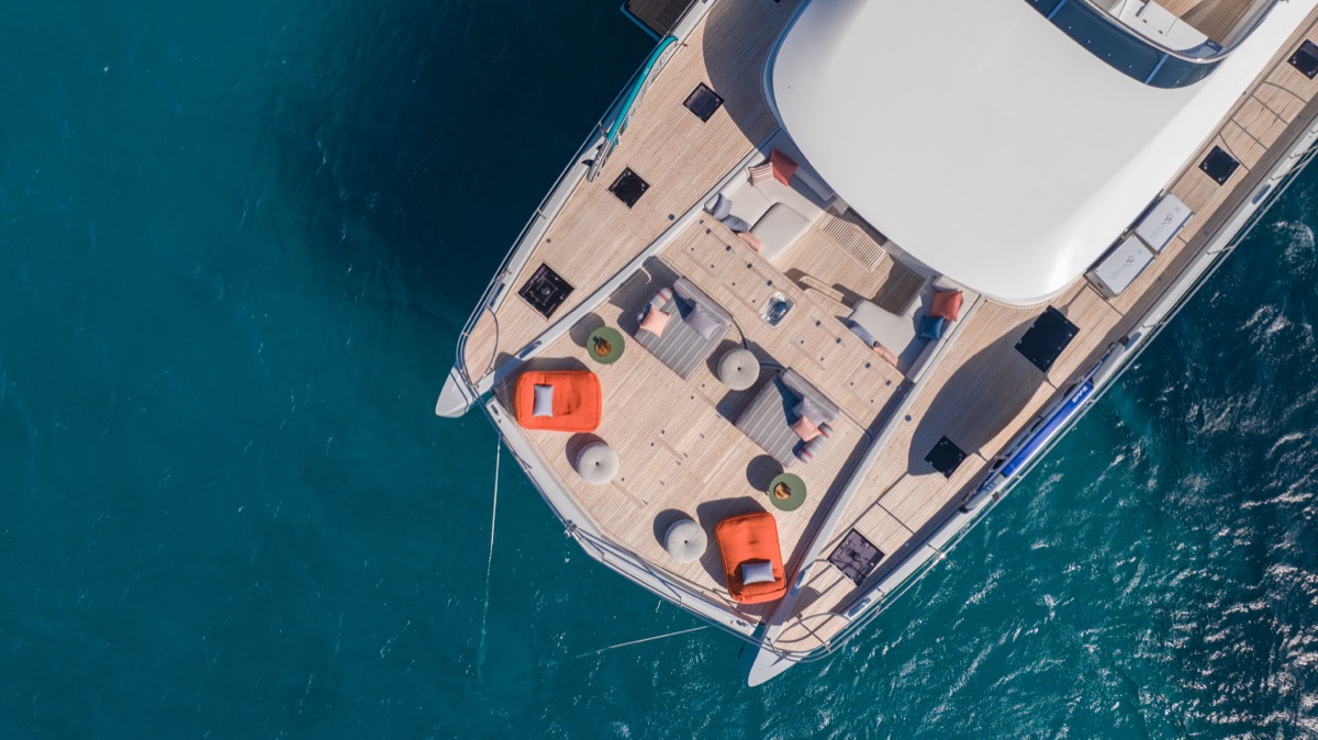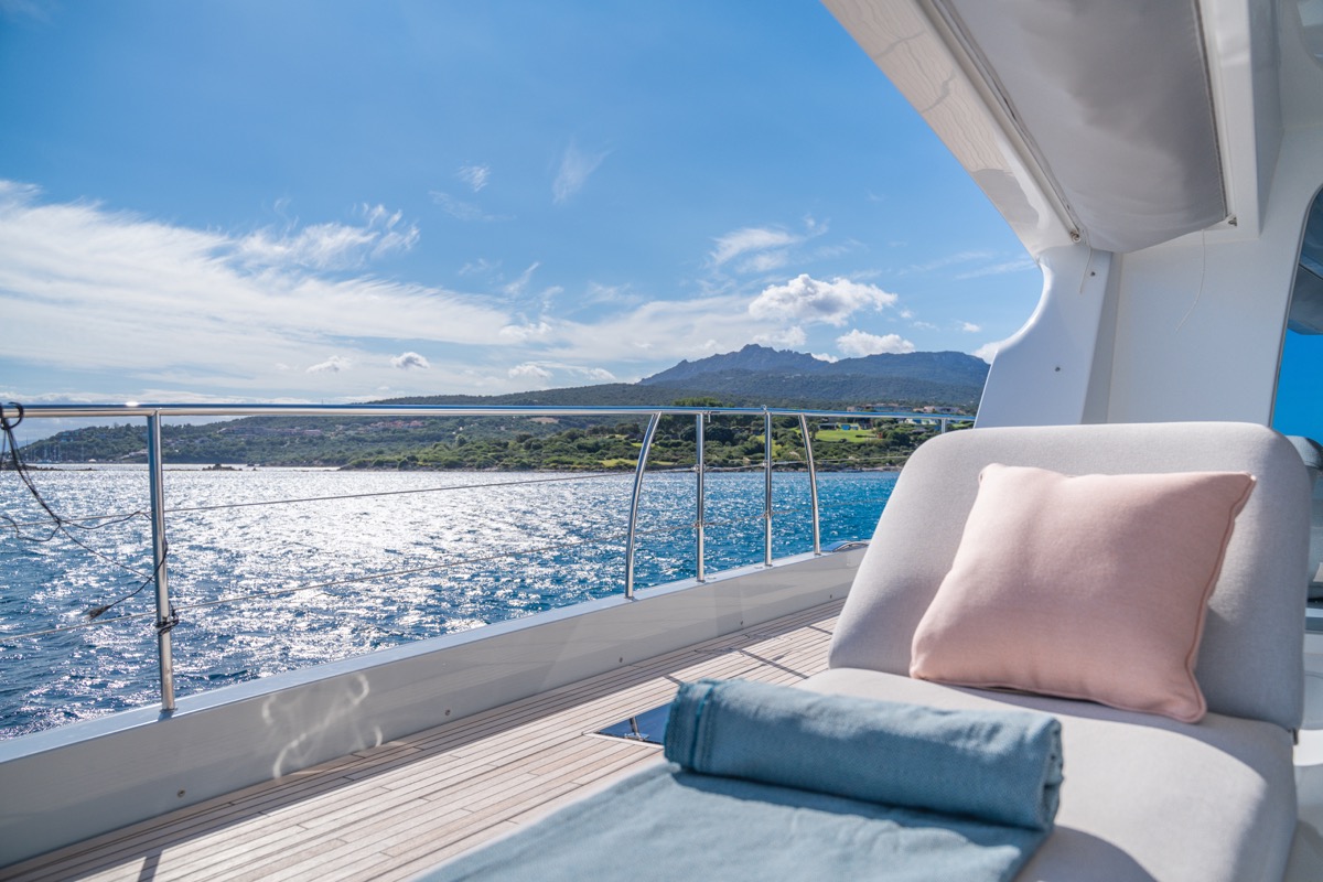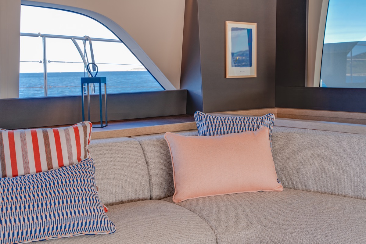 | Outside | Bathing platform, Bimini top, Cockpit shower, Refrigerator in cockpit, Cockpit speakers, Cockpit cushions, Cockpit table, Deck cushions, Mooring lines, Flybridge, hydraul. Gangway, Snorkeling gear, Teak in cockpit, Teak deck, Dinghy hydraulic lifting system |