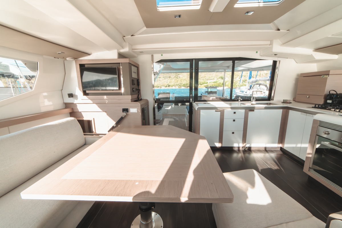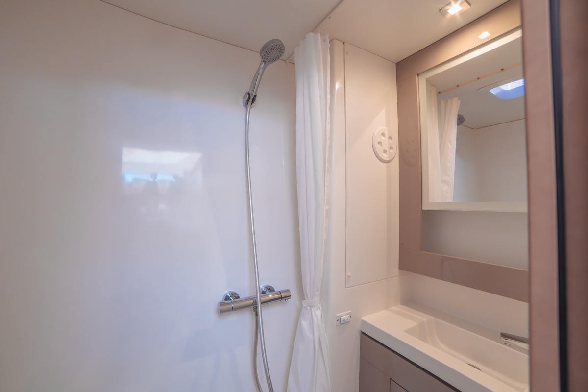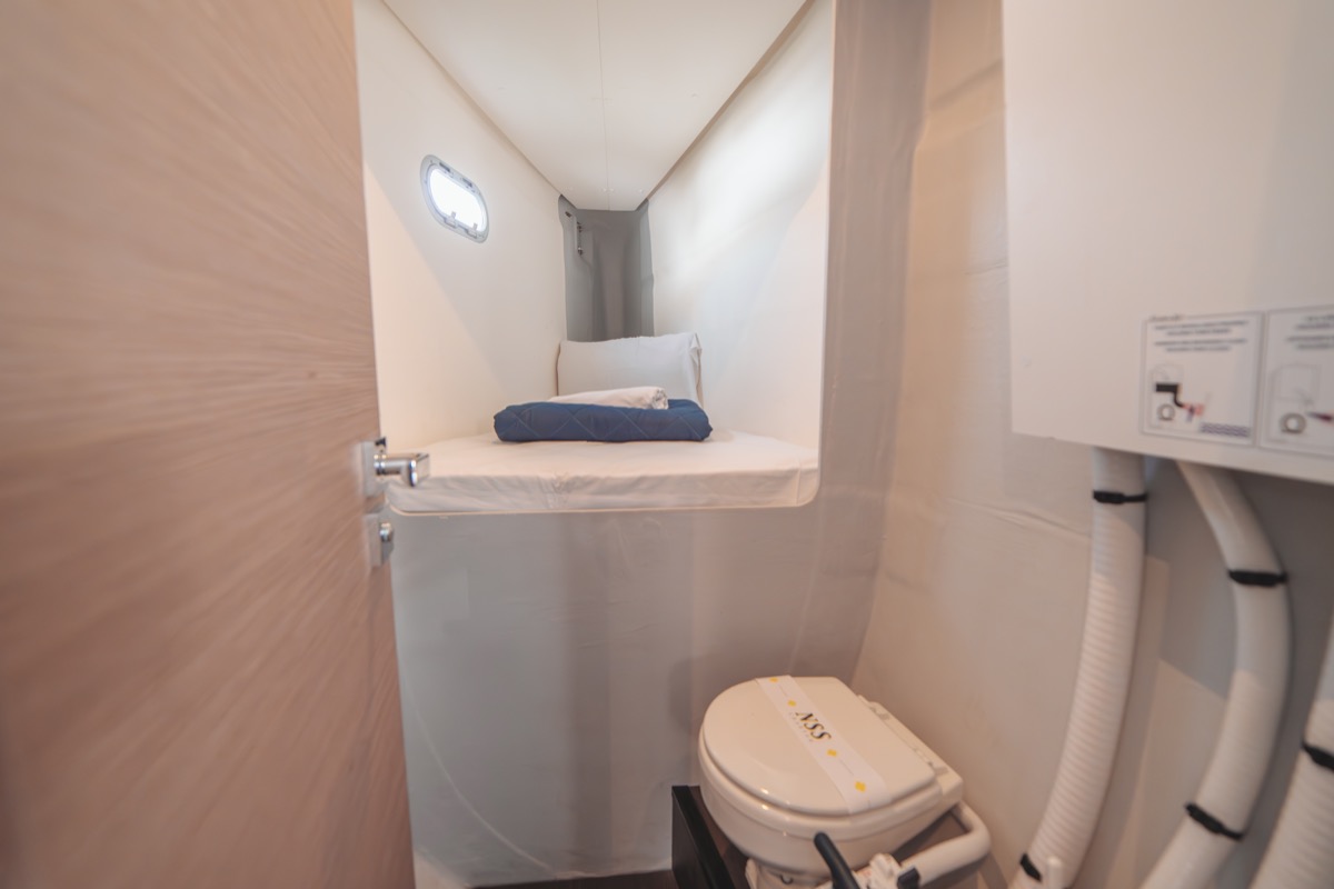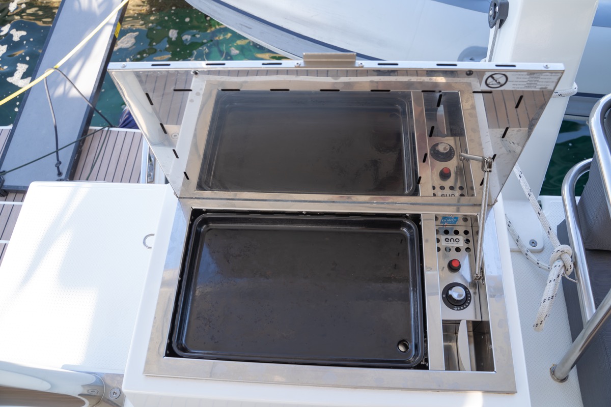| Inside | Oven, Generator, Dishwasher, Inverter 12V/220V, Coffee machine, Airconditioning (independent from shore power), Shore power cable, Moka pot, Pantry equipment, Radio, USB sockets in the cabins, Fan, fans in cabins, Warm water, Watermaker |