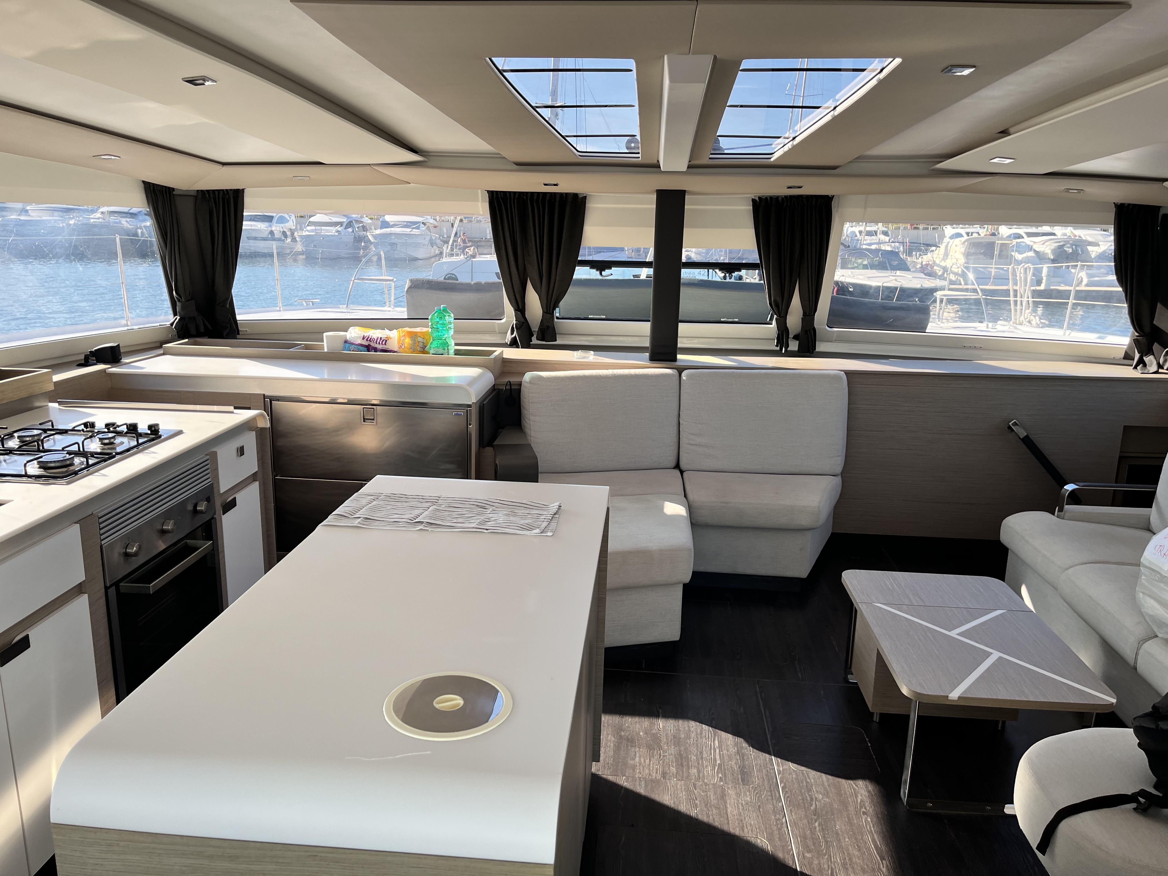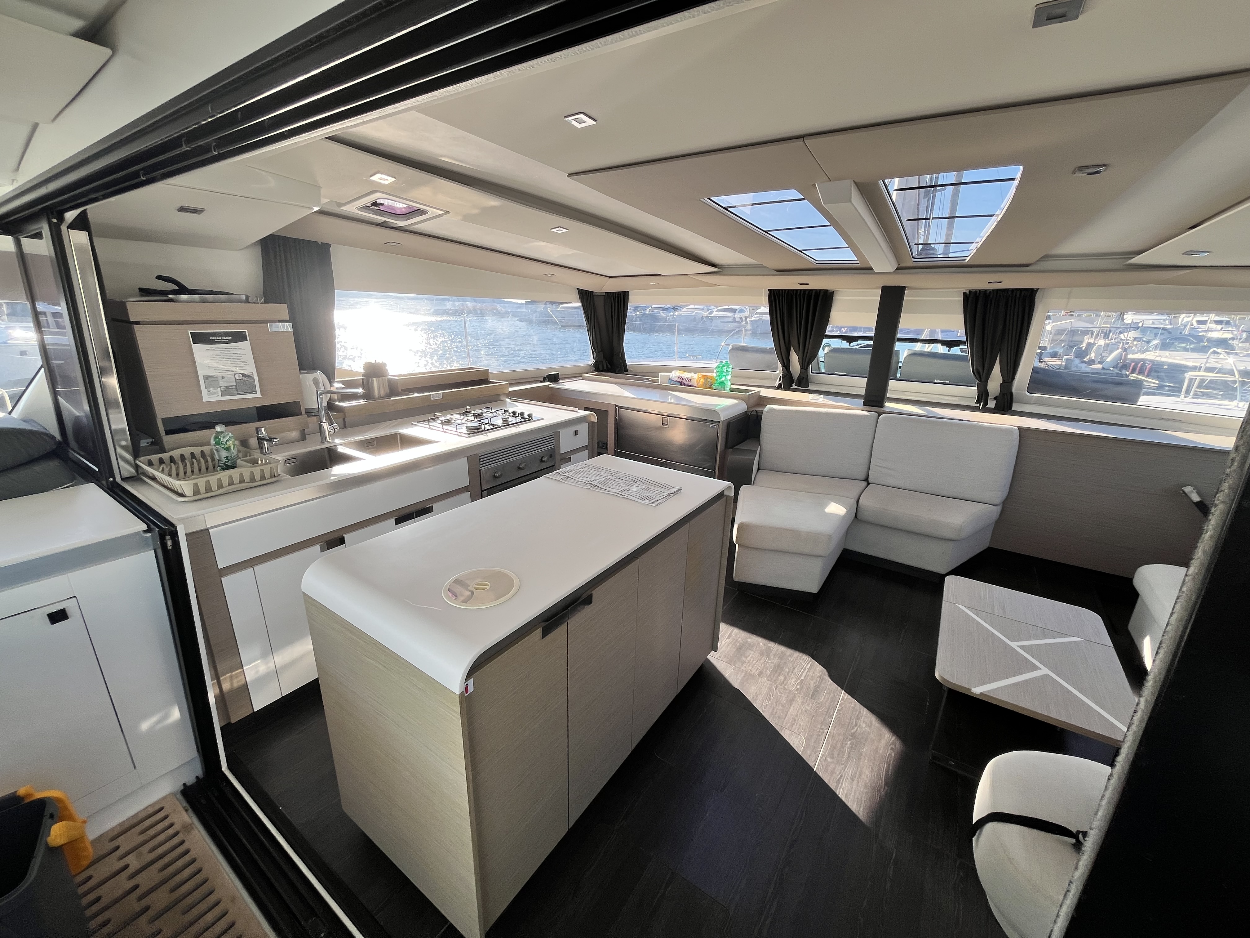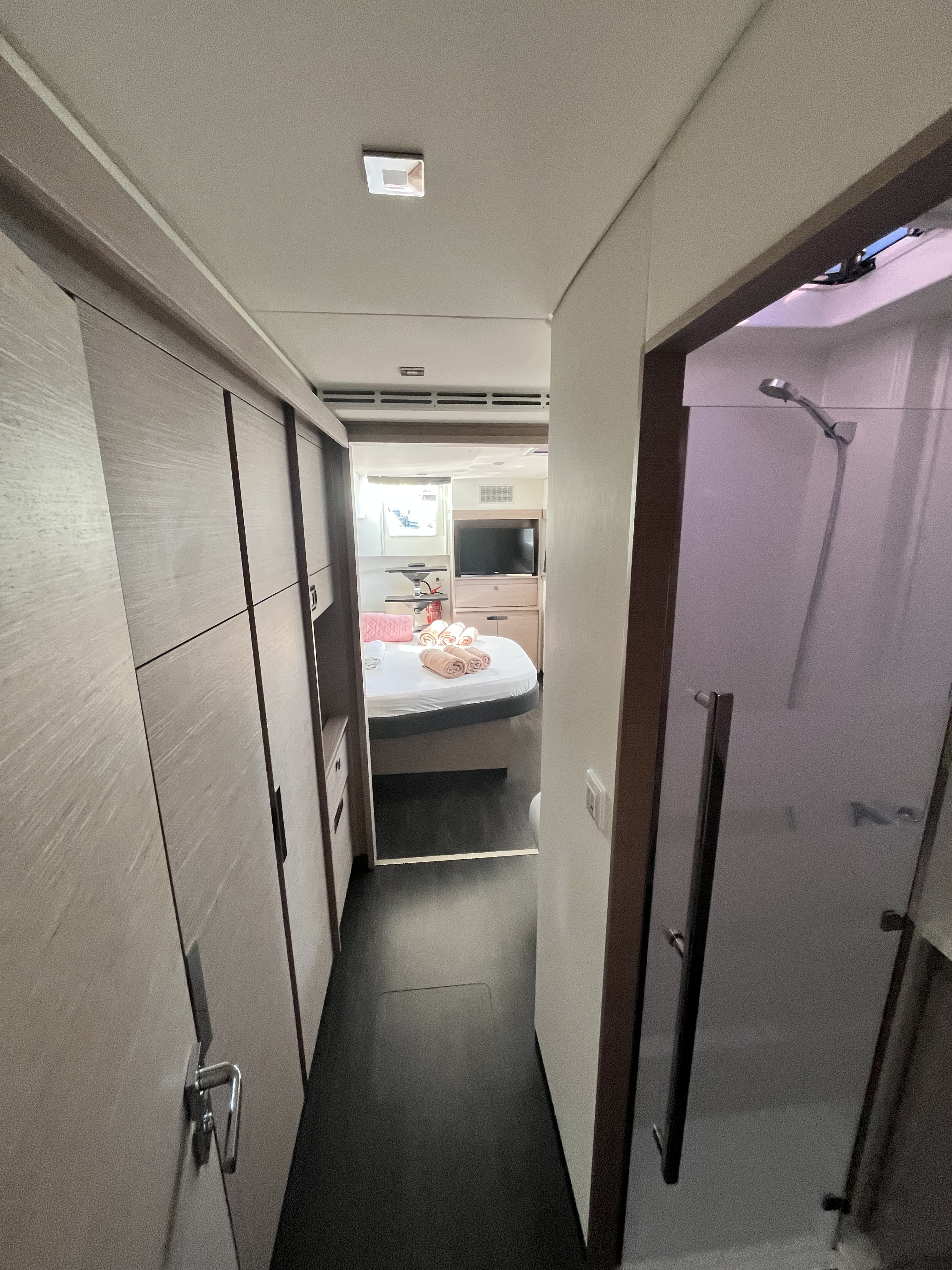| Inside | 12V/220V sockets, Generator, Inverter 12V/220V, Airconditioning (independent from shore power), Refrigerator, Pantry equipment, Radio, TV, fans in cabins, Watermaker |