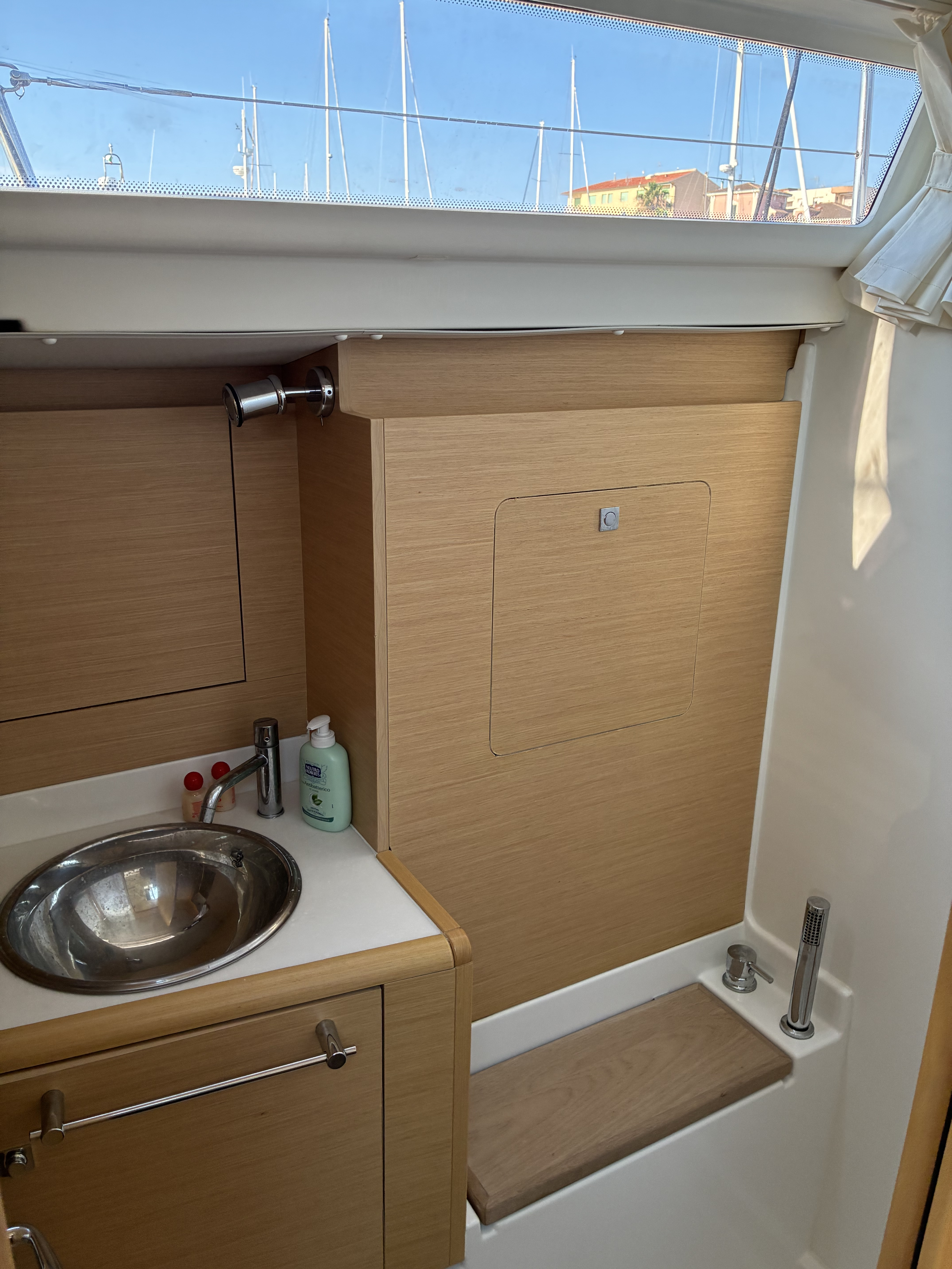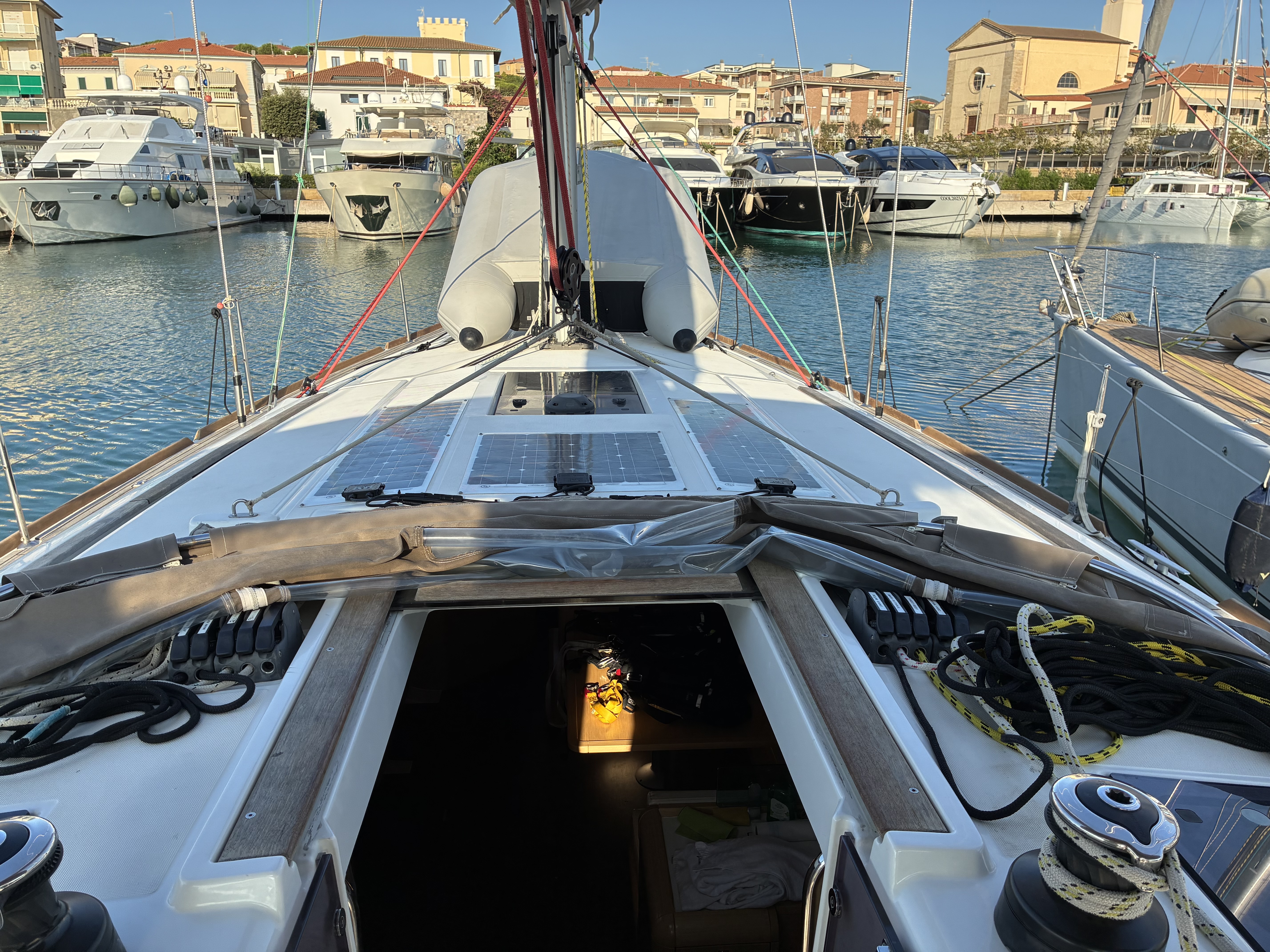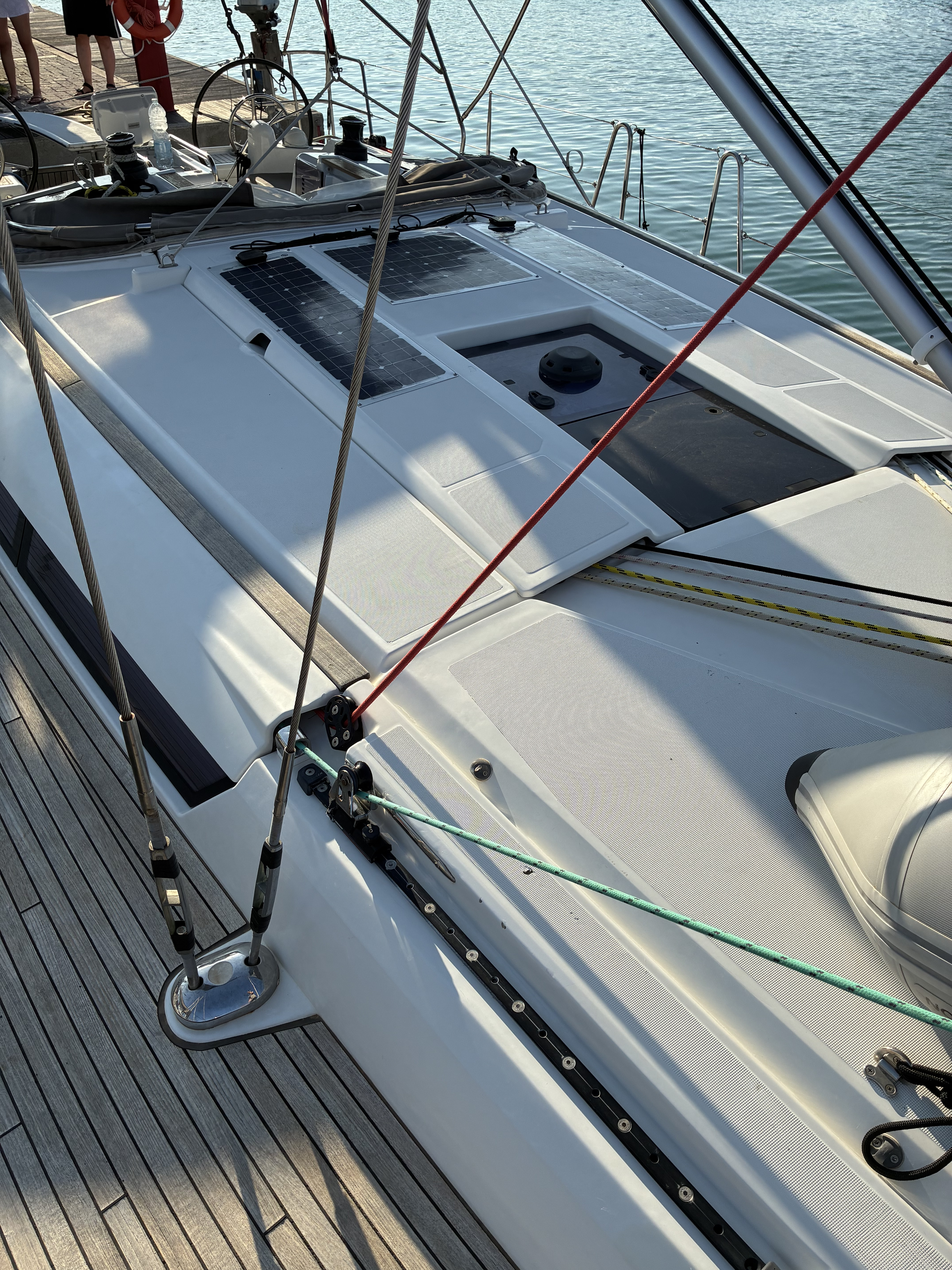 | Outside | 12V - connection, 220V shore connection, Anchor with chain, Bathing ladder, Bimini top, Boat hook, Cockpit shower, Cockpit speakers, Cockpit cushions, Cockpit table, Electr. anchor windlass, Folding propeller, Mooring lines, Gangway, Sails repair kit, Solar panels, Sprayhood, Teak deck, Drift anchor , Windex, Winches |