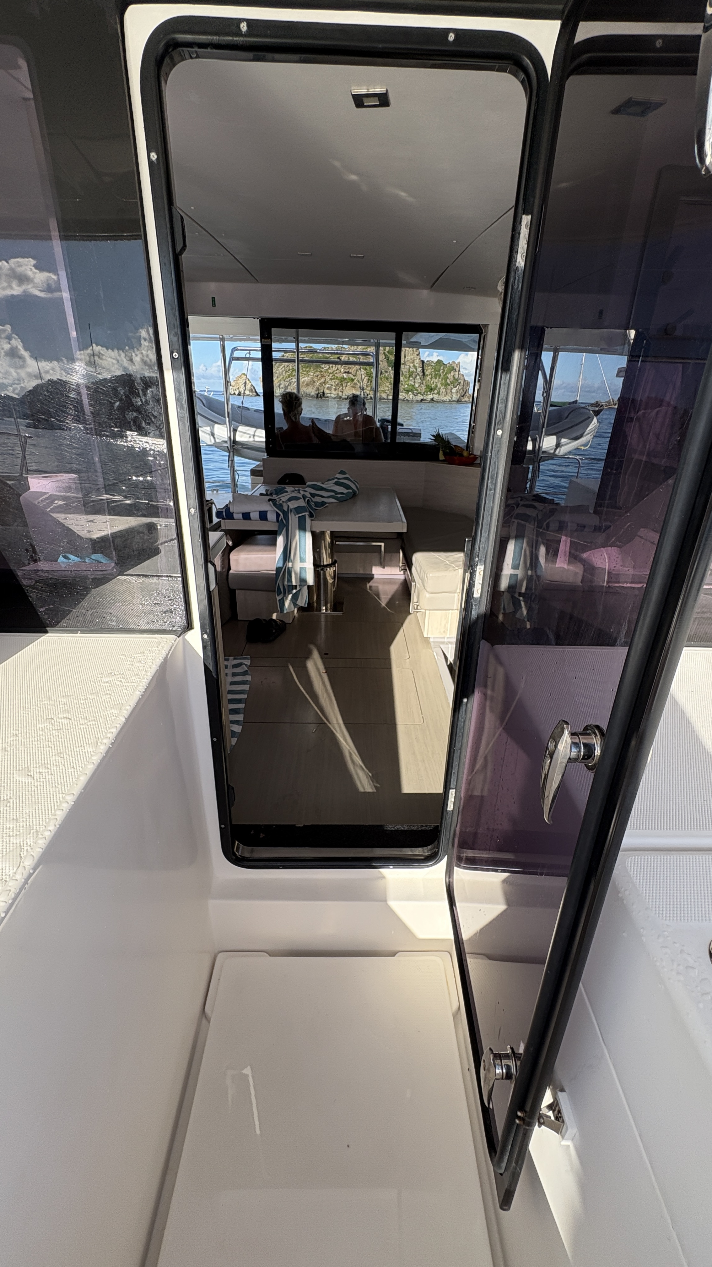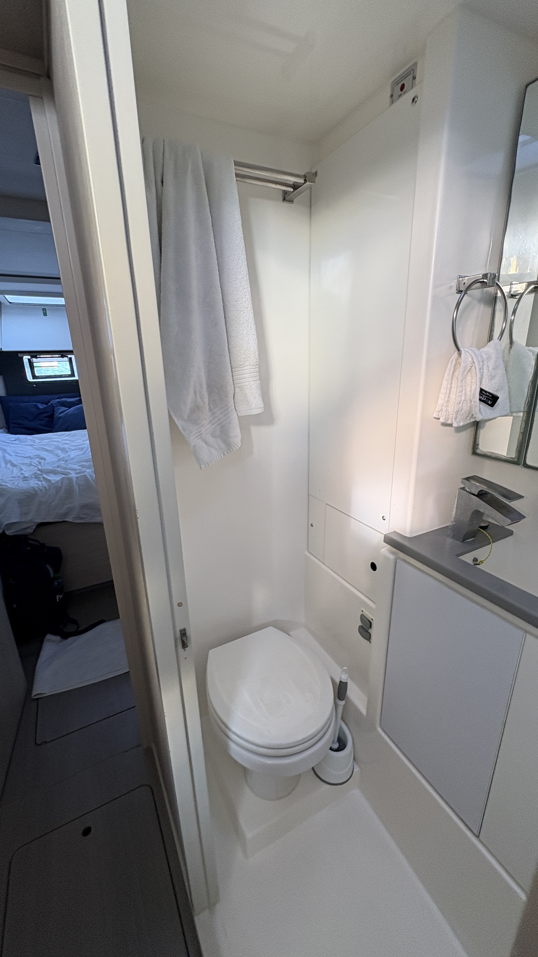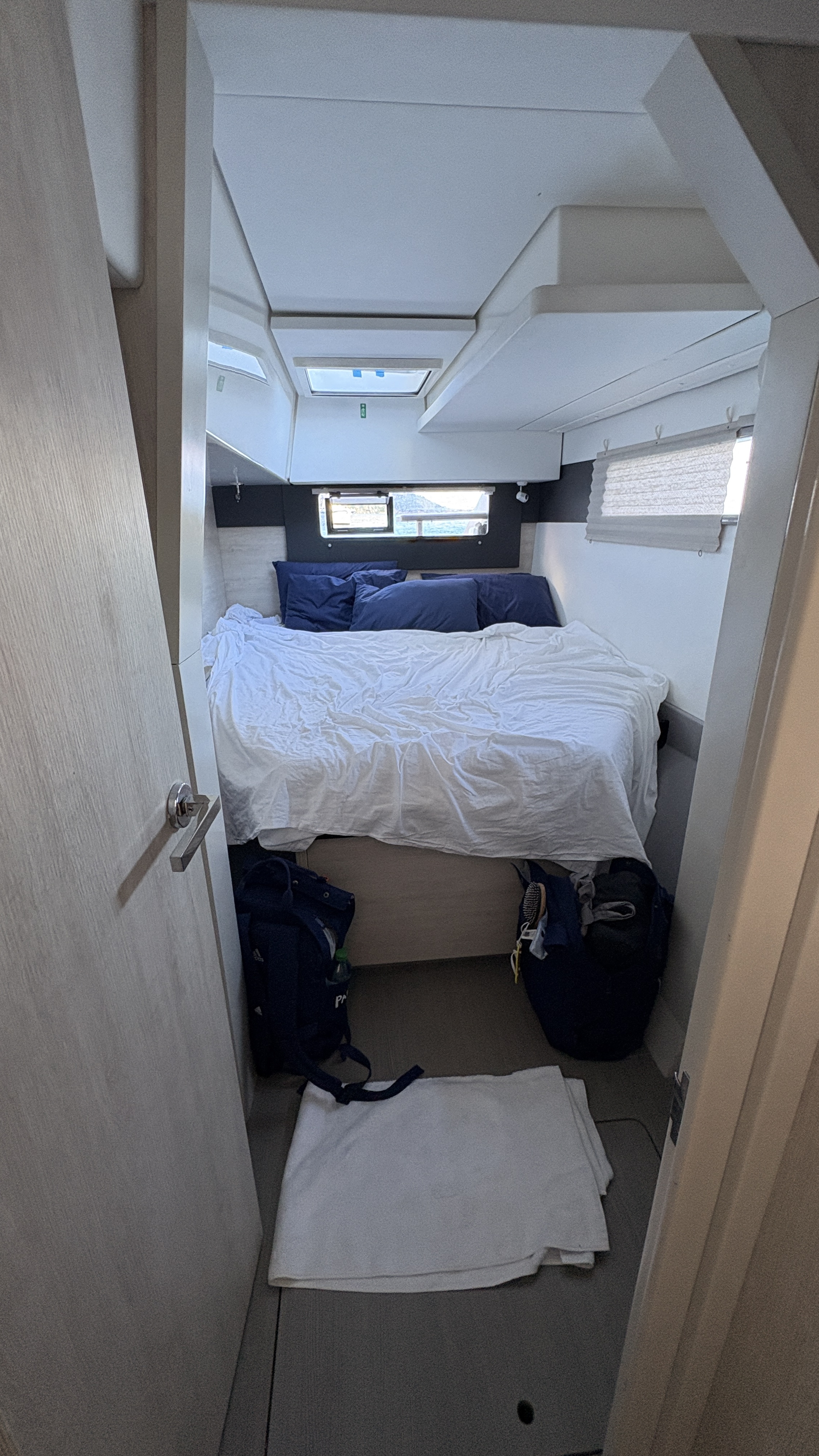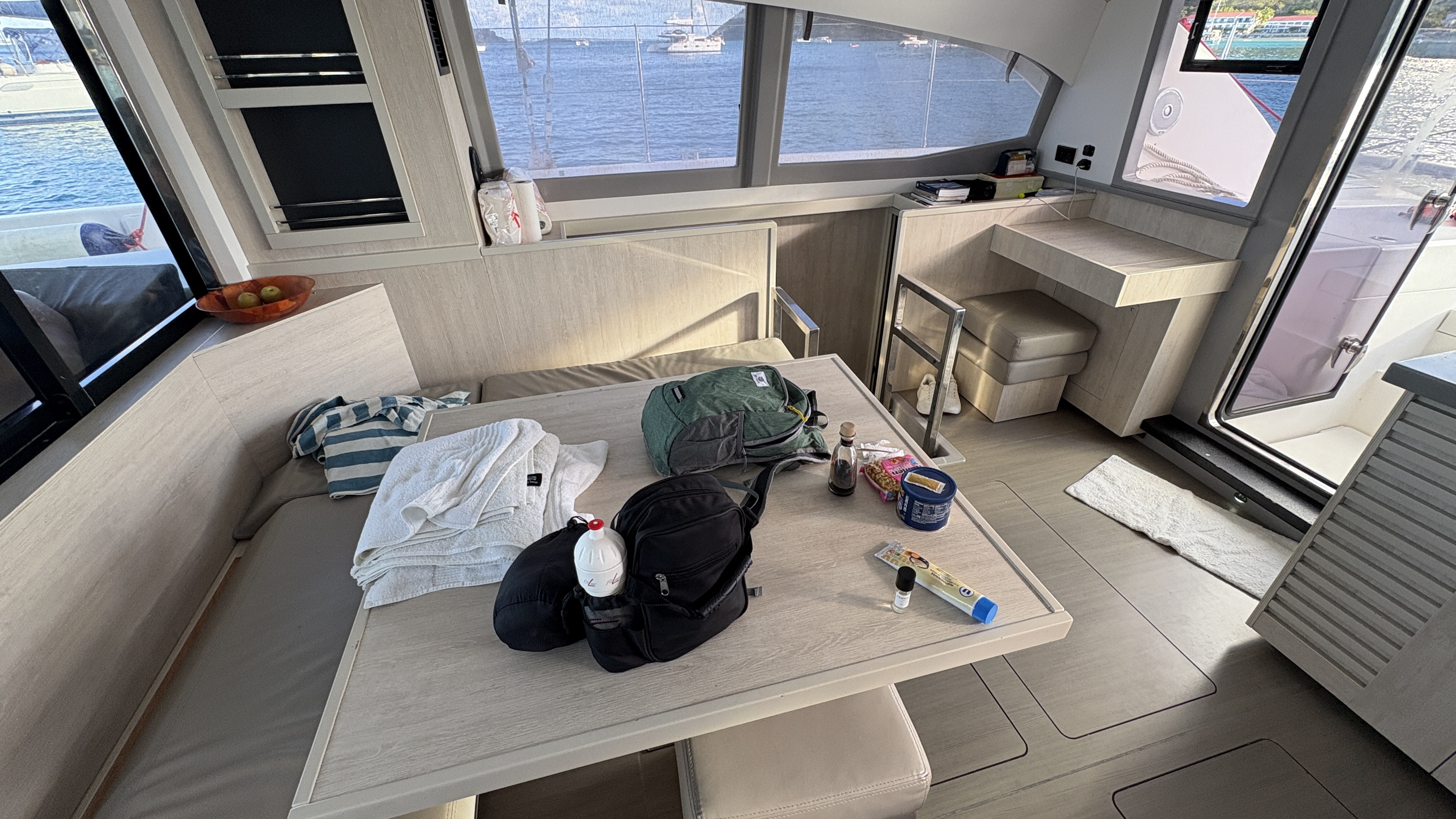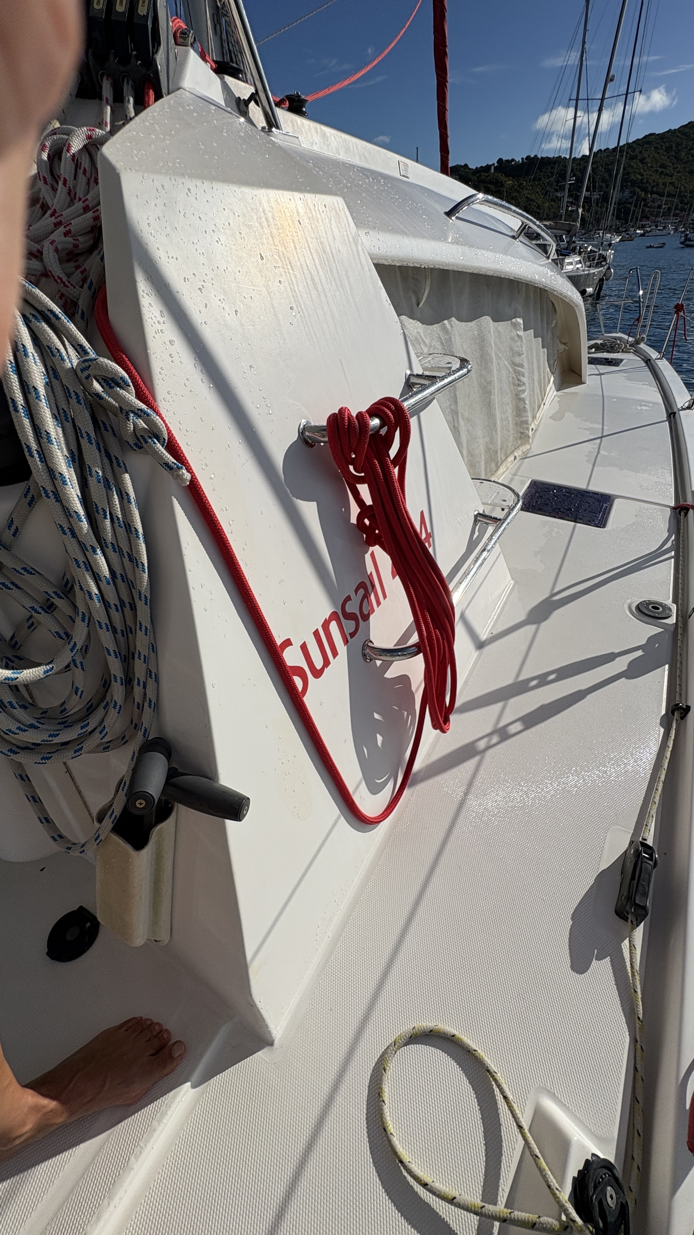 Die Sunsail 404 war grundsätzlich OK für 2 Paare. Man hat schon gemerkt, dass Sie jetzt am Ende ihrer Charterperiode angelangt ist. Moorings teilte uns auch mit, dass das vermutlich die letzte Saison ist. Der Generator war etwas schwach und man musste diesen 3-4 Std. pro Tag laufen lassen damit man so halbwegs durch die Nacht kam. Es gab wiedersprüchliche Aussagen, wie man die Batterie, die eher in schlechtem Zustand war, am besten lädt. Die Einschulung war zückblickend doch recht hastig und wir haben im Laufe des Turns dann mit Rückfragen das Schiff besser kennengelernt. In einer Bucht wurde die Yacht umgestellt ohne das man uns hier informiert hat um bei drehenden Winden Kollisionen zu vermeiden. Das ist zwar sehr umsichtig, doch ein Anruf hätte genügt und wir hätten davon gewusst. Man hat sich da offensichtlich einen Spaß erlaubt. Grundsätzlich waren aber alle sehr freundlich und hilfsbereit. Man kann Moorings/Sunsail vor Ort gut weiterempfehlen. Betankung und Rückgabe der Yacht haben Sie selbst übernommen und wir haben nur assistiert und als wir mal technischen Service haben wollten haben sie sehr schnell reagiert und wir konnten schnell weitersegeln. Die Unterstützung beim Ein- Ausklarieren war auch sehr gut. Steckdosen liefen nur, wenn man den Generator hat laufen lassen, mit Motor lief dieser nicht. Die Fotovoltaik an Bord konnte man vergessen, die war nur zierde. Beiboot war OK, hat aber nach einer Woche fix Luft verloren. Mit dem Wasservorrat sind 4 Personen gut ausgekommen und das Tanken war auch kostengünstig. Wir sind viel gesegelt (85 sm) und mussten nur 41 l nachtanken.