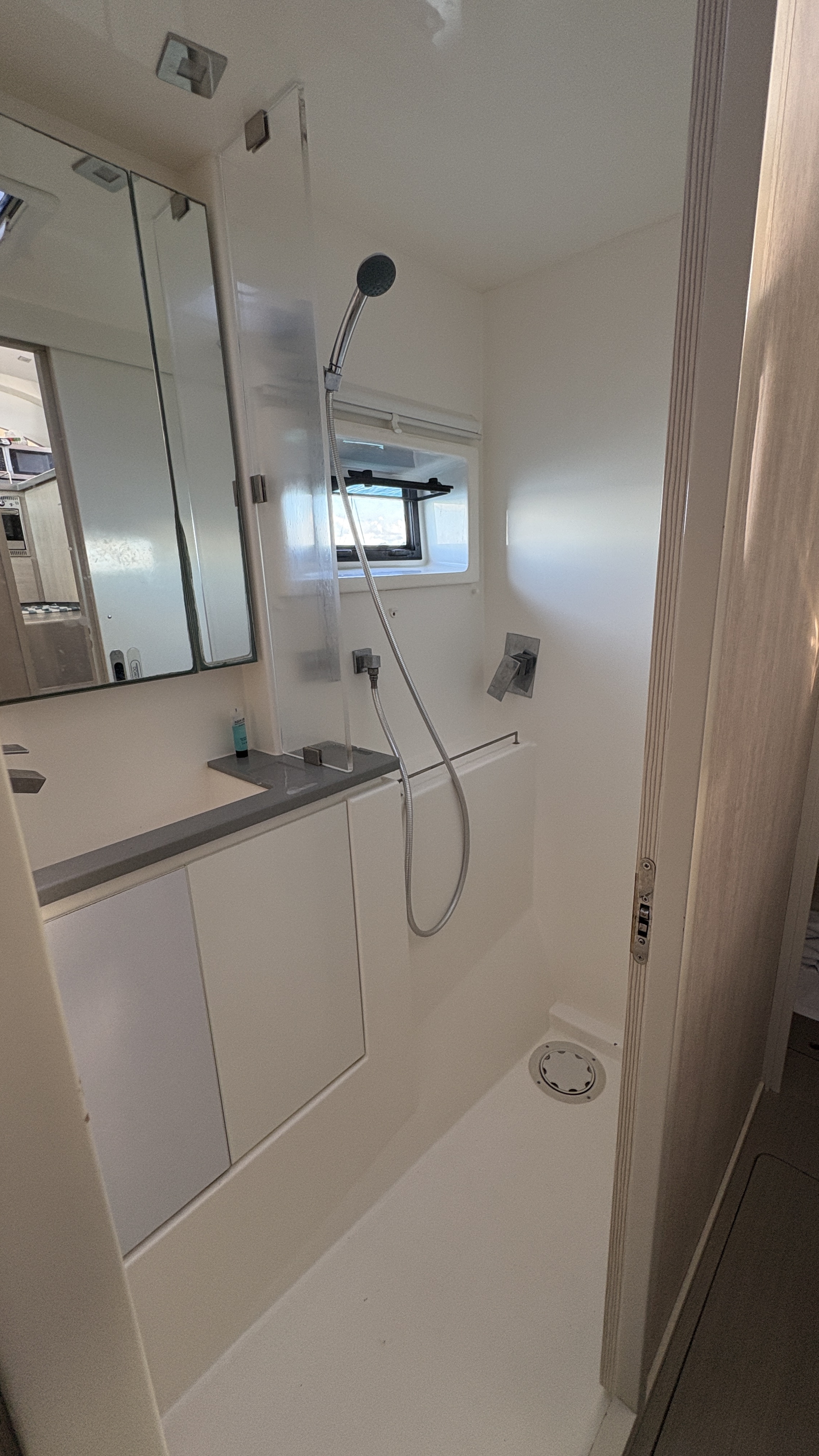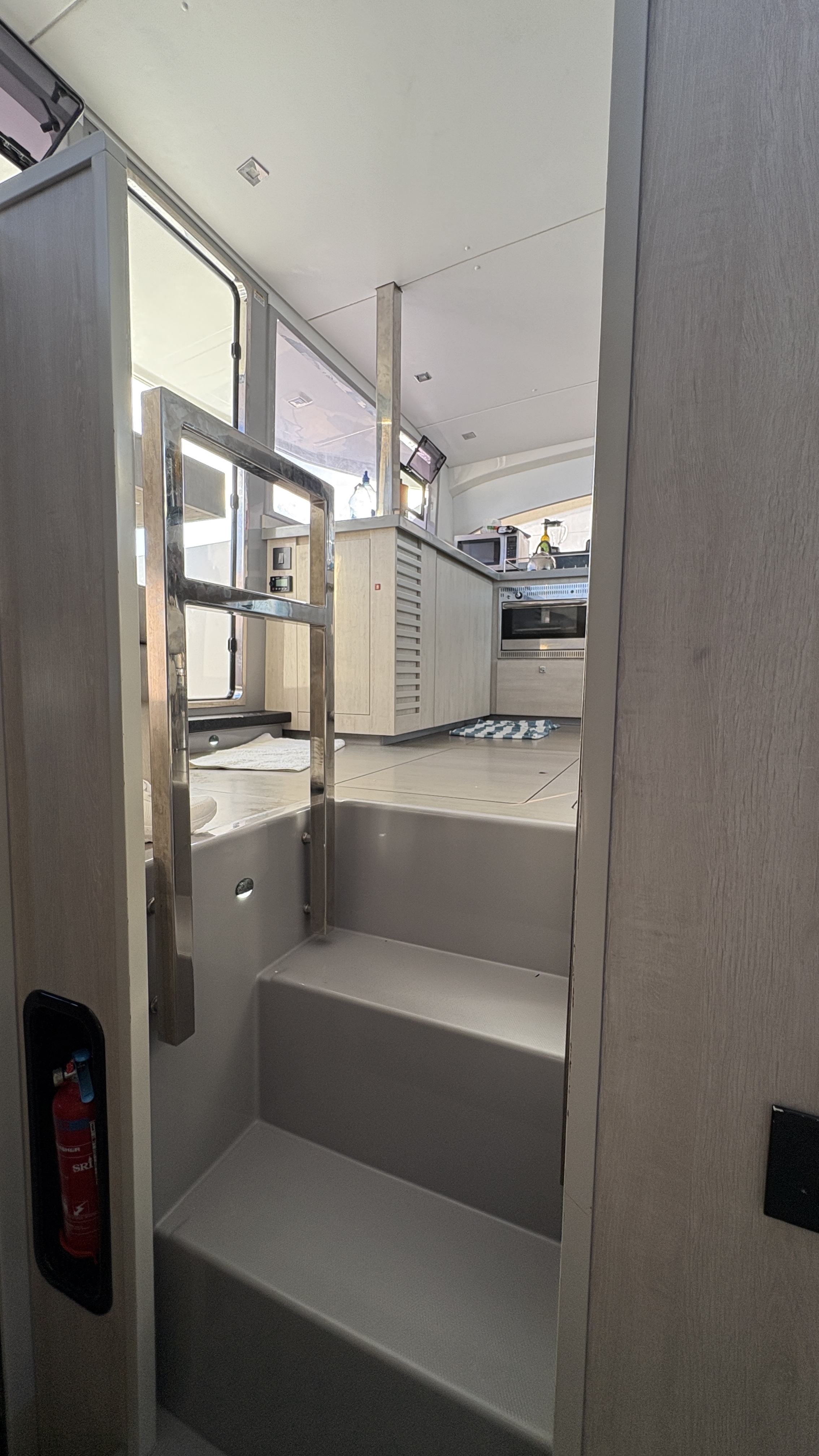 | Outside | 12V - connection, Anchor with chain, Bathing ladder, Bimini top, Boat hook, Cockpit shower hot/cold, Cockpit speakers, Cockpit cushions, Cockpit table, Davits, Cover brush, Delta anchor, Electr. anchor windlass, electr. winch, Fender, Mooring lines, Gangway, Hardtop, Stern shower, Snorkeling gear, Solar panels, Water hose, Windex, Winches |