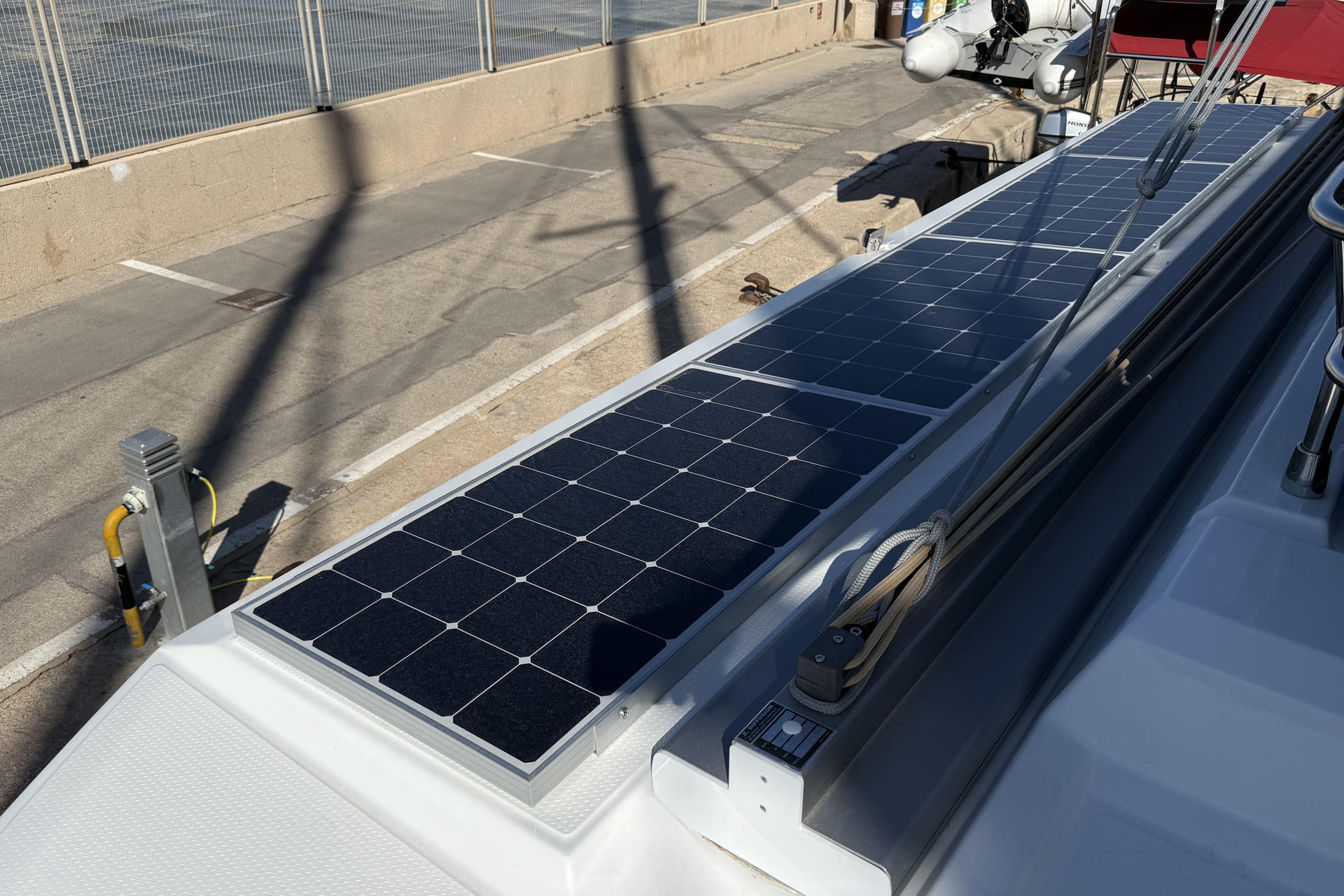 | Outside | 12V - connection, 220V shore connection, Anchor with chain, Bathing ladder, Bathing platform (hydr.), Bimini top, Boat hook, Cockpit shower, Cockpit speakers, Cockpit cushions, Cockpit table, Cover brush, Deck cushions, Jerry cans for diesel, Electr. anchor windlass, electr. winch, Halyard winches, Fender, Mooring lines, Gangway, BBQ, Snorkeling gear, Railing, Solar panels, Sprayhood, Teak in cockpit, Windex, Winches |