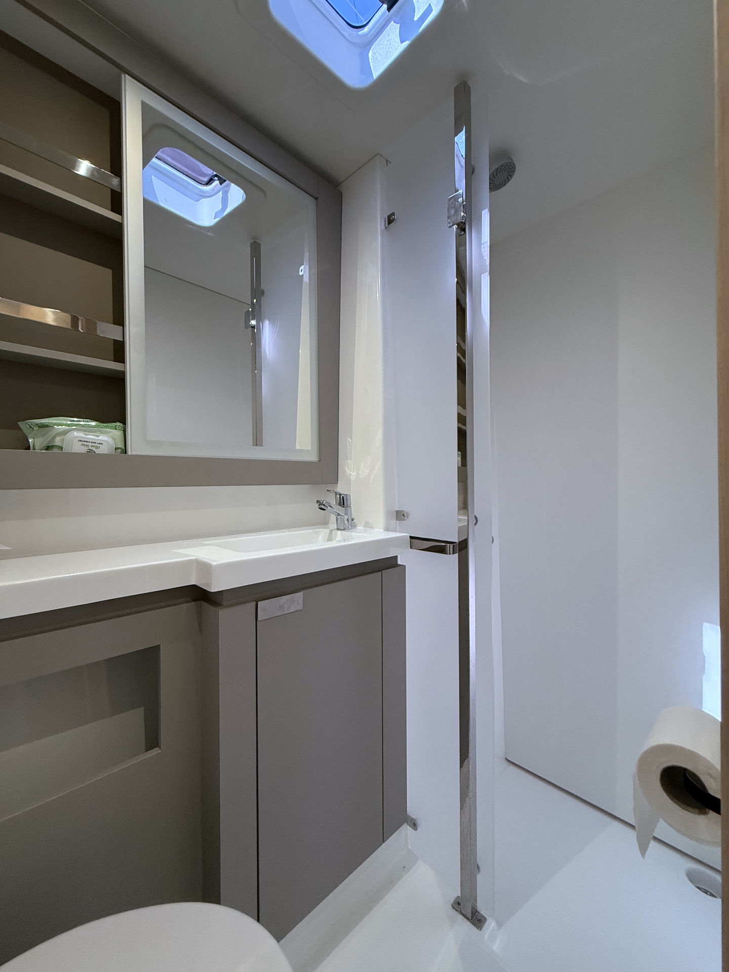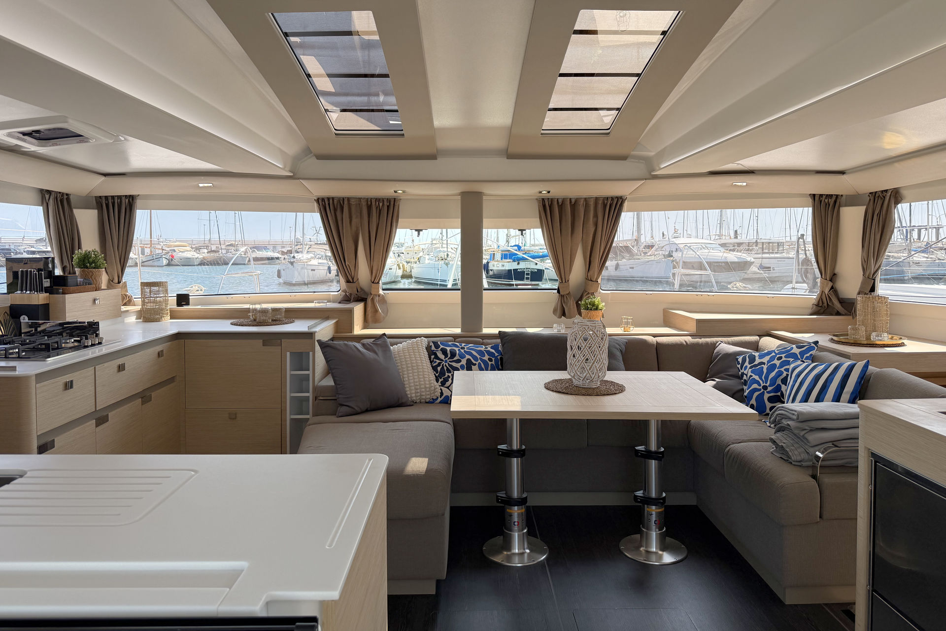 | Inside | 220V sockets, Oven, Clock, Pressurised water, Black water tank, Gas oven, Generator, Heating, Airconditioning (independent from shore power), Converter 230V/12V, Refrigerator, Battery charger, Shore power cable, Pantry equipment, Radio with CD and MP3, Safe for valuables, Sink, USB Socket, Fan, Warm water, Watermaker |