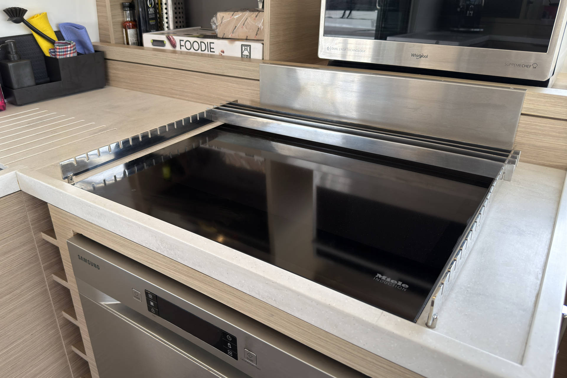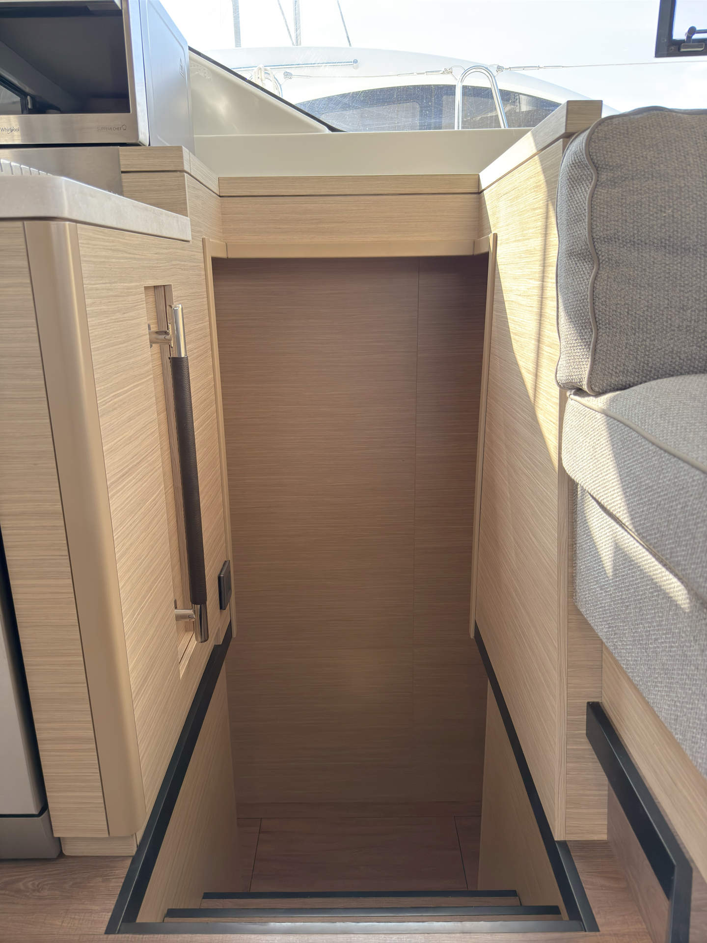 | Inside | 220V sockets, Oven, Clock, Pressurised water, Ice cube machine, Black water tank, Gas oven, Freezer, Generator, Dishwasher, Air heating, Heating, Inverter 12V/220V, Coffee machine, Airconditioning (independent from shore power), Refrigerator, Shore power cable, Microwave oven, Pantry equipment, Radio, Safe for valuables, Sink, Dryer, USB sockets in saloon and cabins, Warm water, Washing machine, Watermaker |