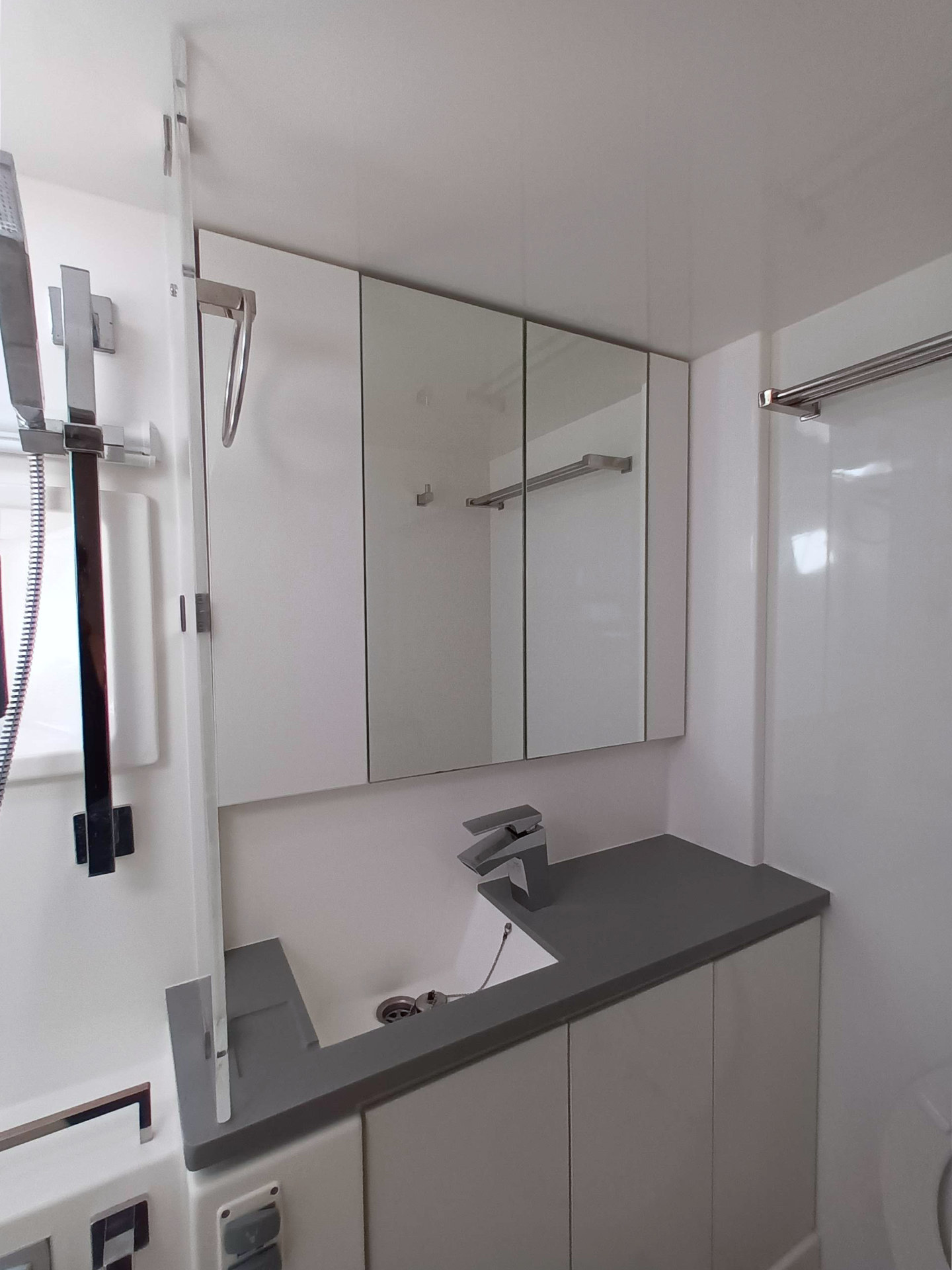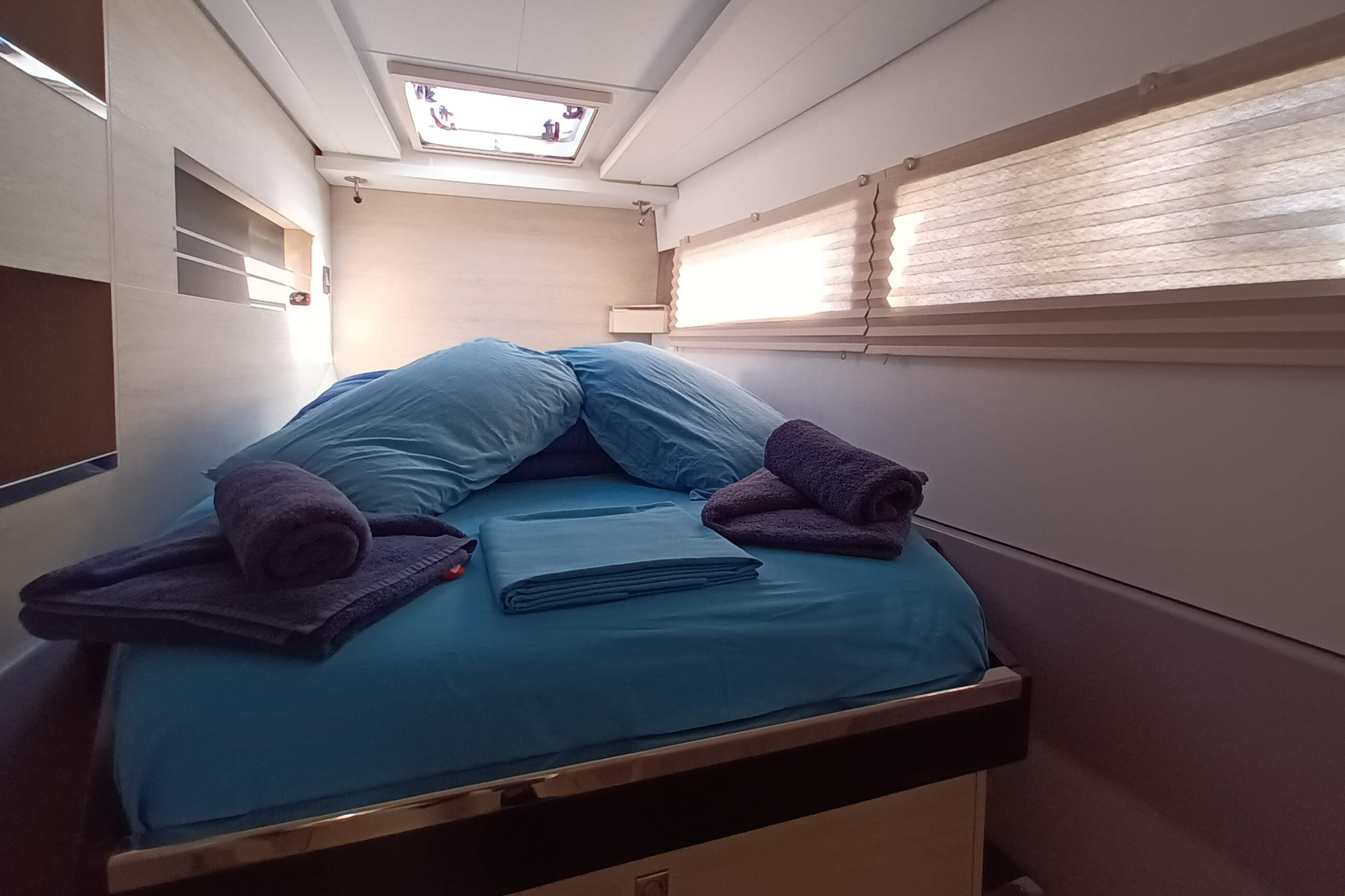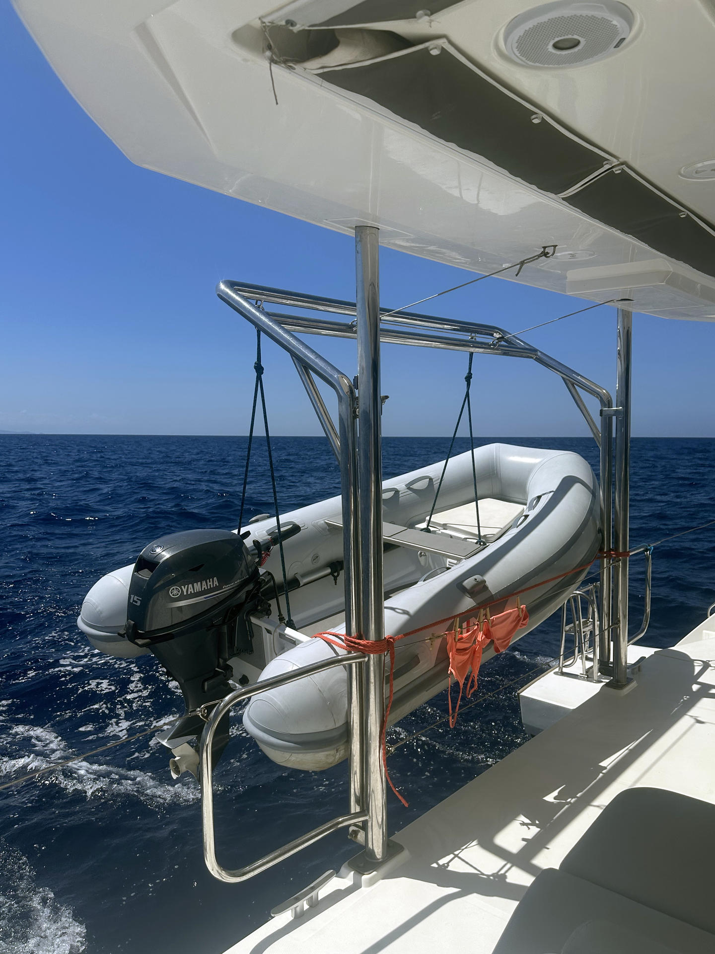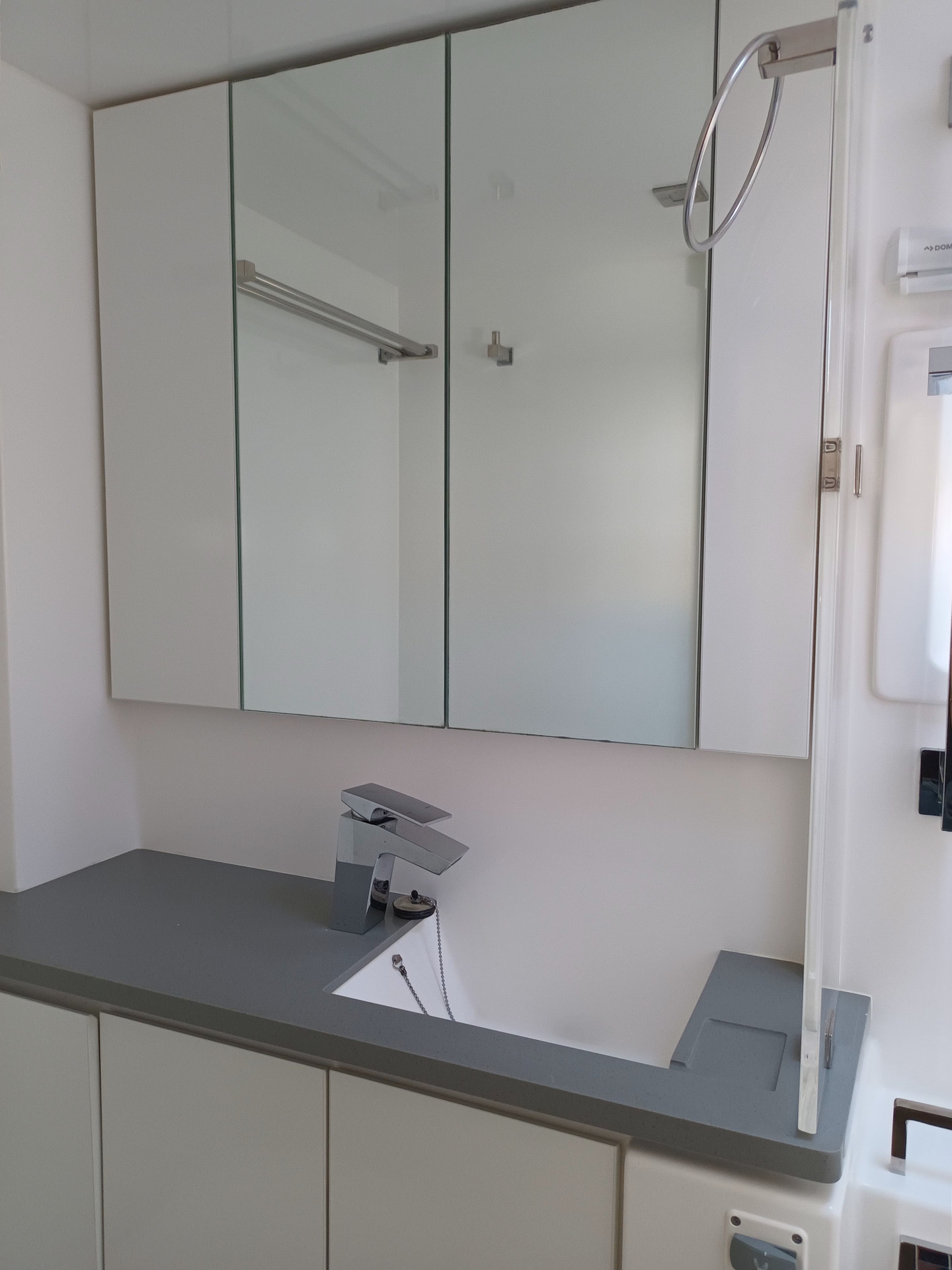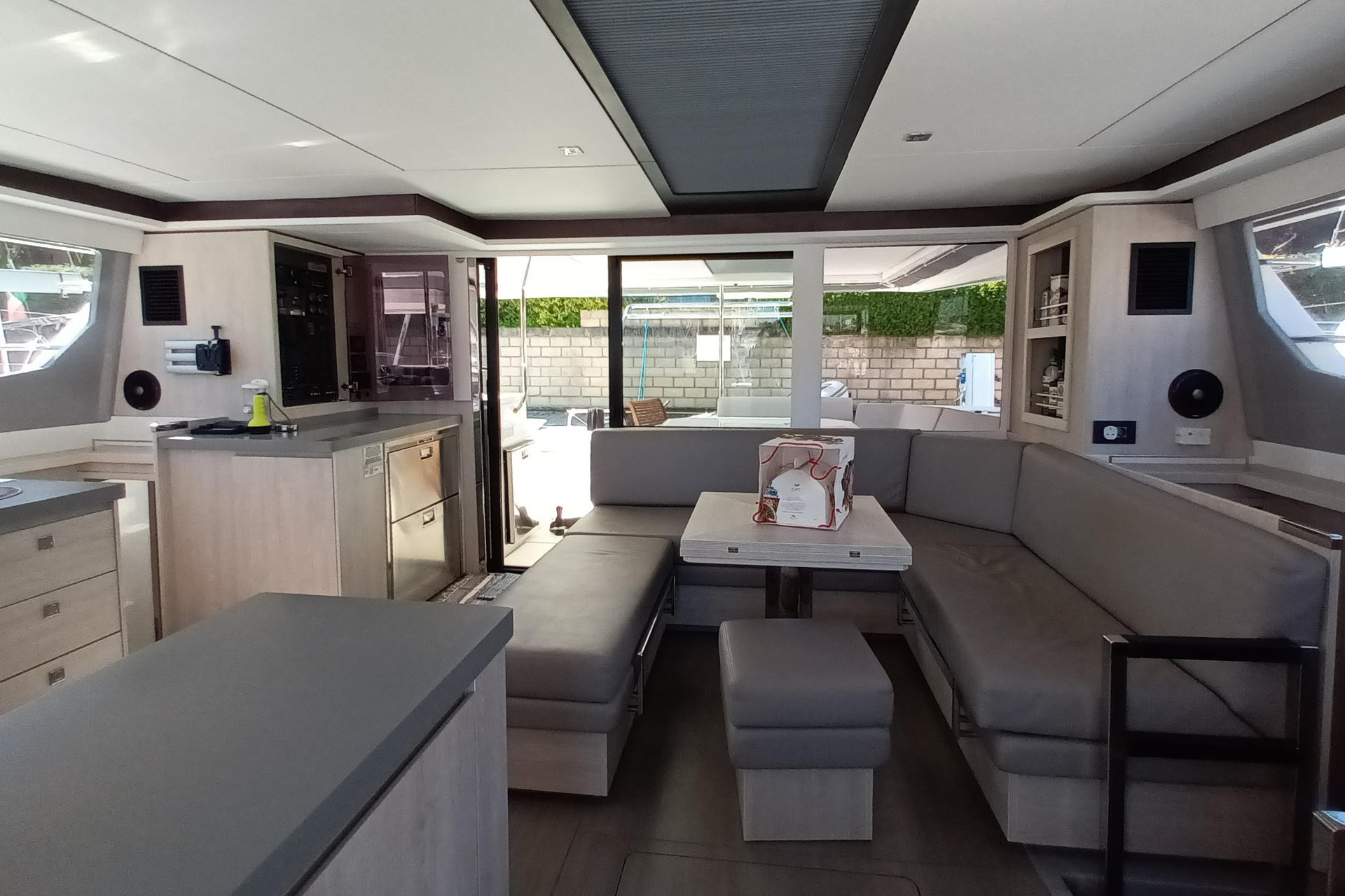 | Inside | 220V sockets, Oven, Clock, Ceiling lamp, Pressurised water, Black water tank, Gas oven, Freezer, Generator, Heating, Inverter 12V/220V, Coffee machine, Airconditioning (independent from shore power), Refrigerator, Battery charger, Microwave oven, Pantry equipment, Radio with CD and MP3, Safe for valuables, Convertible salon table, Sink, Cabin & dining area fan , Warm water, Watermaker |