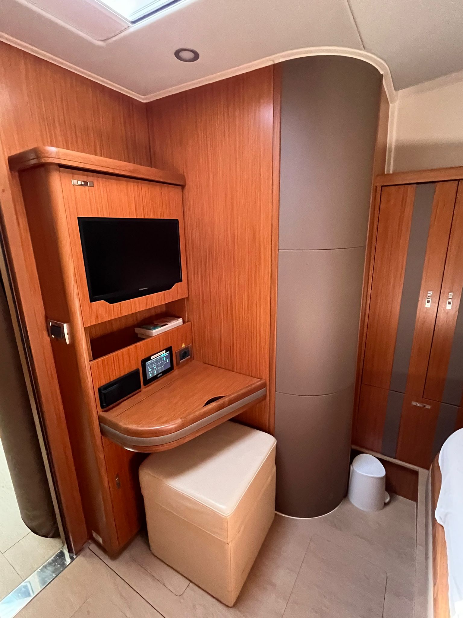 | Inside | Ice cube machine, Freshwater pump, Fusion sound system , gas detector, Freezer, Generator, Dishwasher, Heating, Coffee machine, Airconditioning (independent from shore power), Converter 230V/12V, Refrigerator, Speakers in saloon, LCD TV, Safe for valuables, Convertible salon table, Warm water, Washing machine and dryer, WC (electr.) |