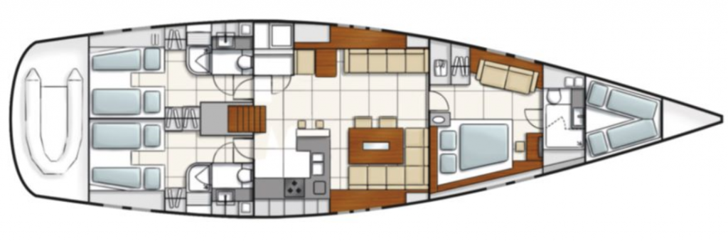 | Outside | Bathing platform, Bimini top, Cockpit speakers, Deck cushions, electr. winch, Solar panels, Tender garage |