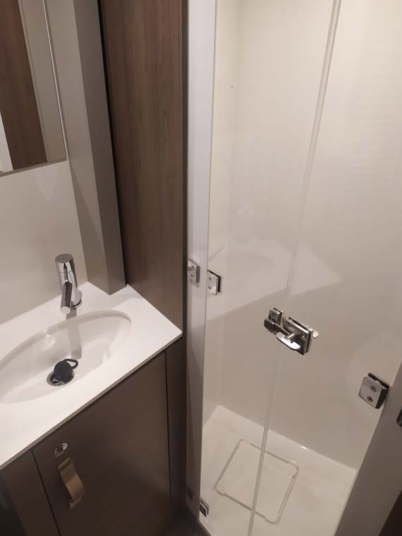 | Outside | 12V - connection, Anchor with chain, Bathing ladder, Bathing platform, Bimini top, Cockpit shower, Cockpit table, Electr. anchor windlass, electr. winch, Fender, Mooring lines, Gangway, BBQ, Solar panels, Sprayhood, Water hose, Windex |