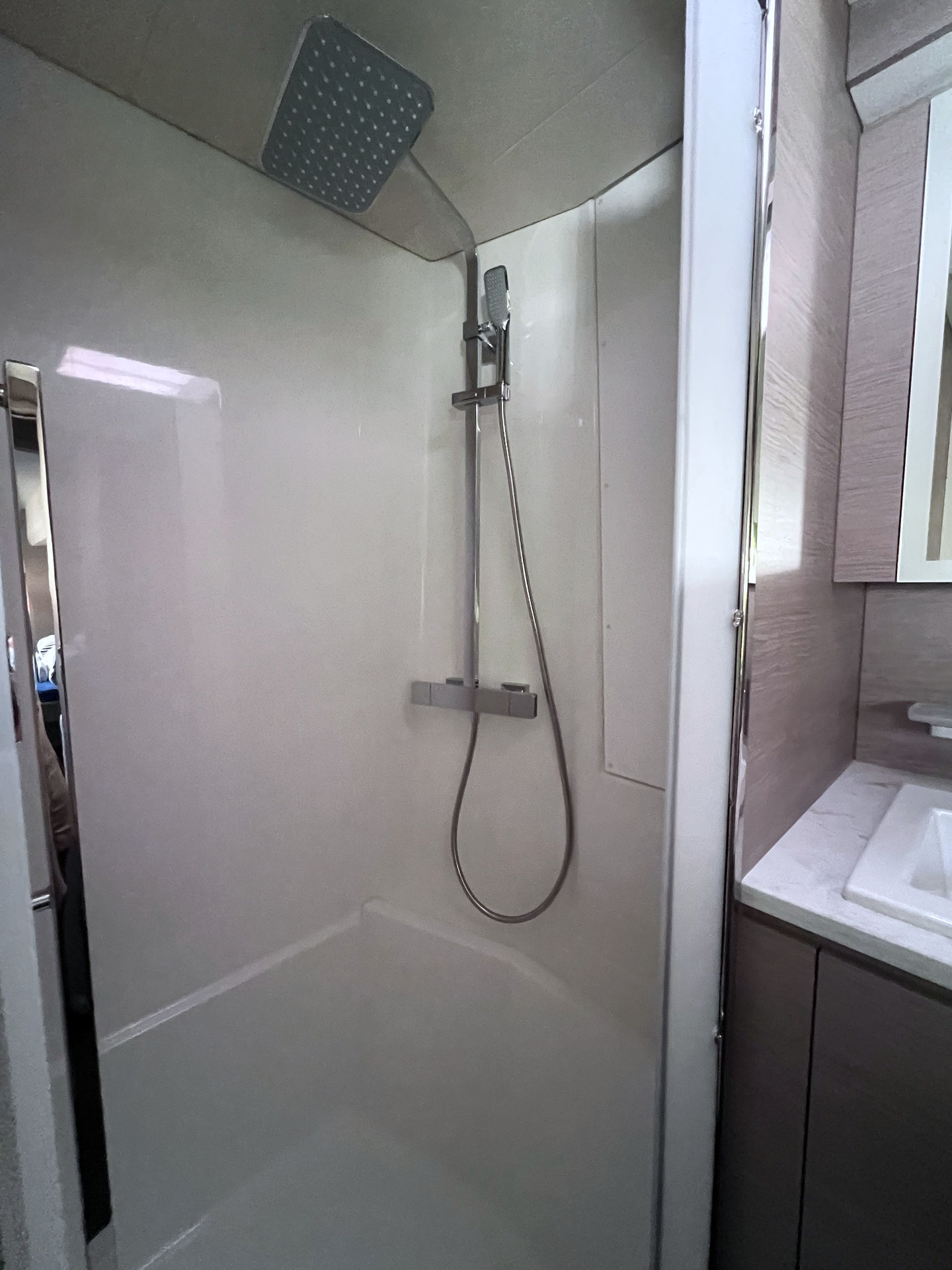 | Inside | 220V sockets, Oven, Clock, Pressurised water, Black water tank, Gas oven, Freezer, Generator, Dishwasher, Airconditioning (independent from shore power), Converter 230V/12V, Refrigerator, Shore power cable, Microwave oven, Pantry equipment, Radio with CD and MP3, Safe for valuables, Sink, Dryer, Warm water, Washing machine, Watermaker |