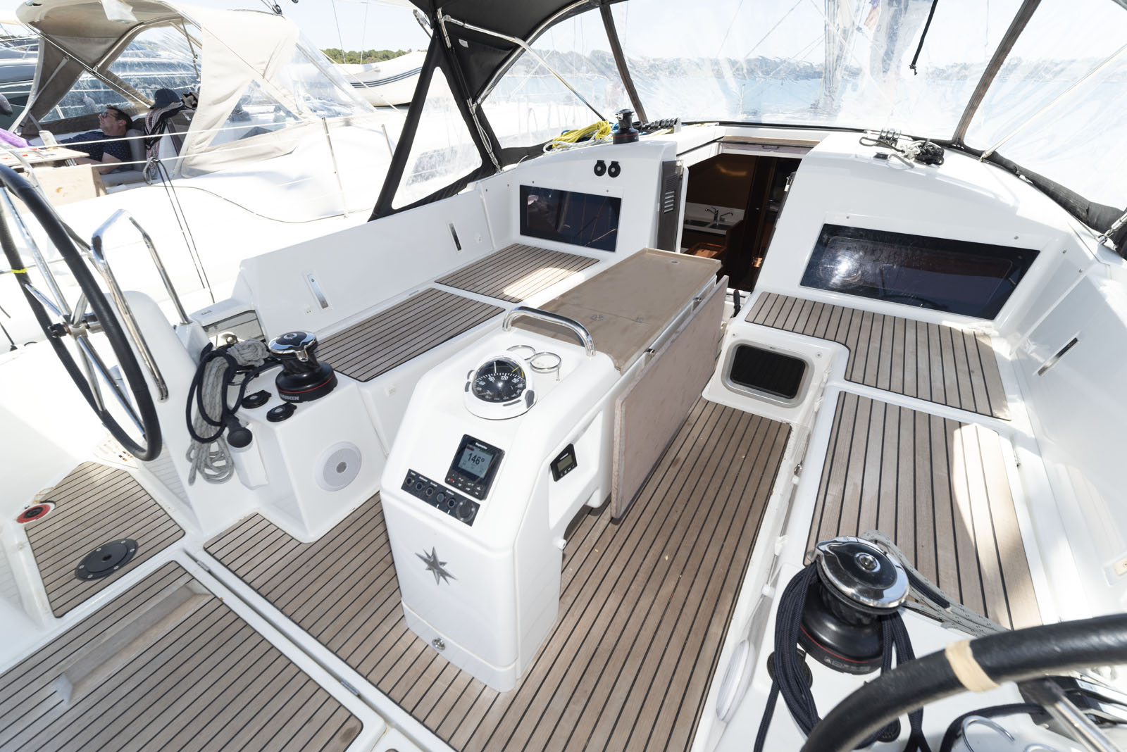 | Outside | Bathing platform (hydr.), Bimini top, Cockpit speakers, Cockpit cushions, Foldable cockpit table, Electr. anchor windlass, electr. winch, Fender, Sprayhood, Teak deck |