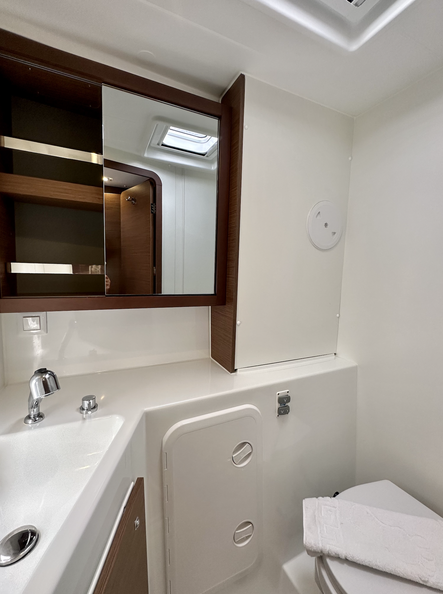 | Outside | Bathing ladder, Boat hook, Cockpit shower, Cockpit speakers, Cockpit table, Electr. anchor windlass, Fender, Lifeline system, Solar panels, Teak in cockpit |