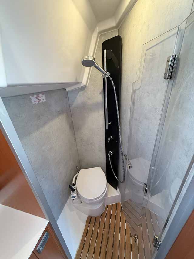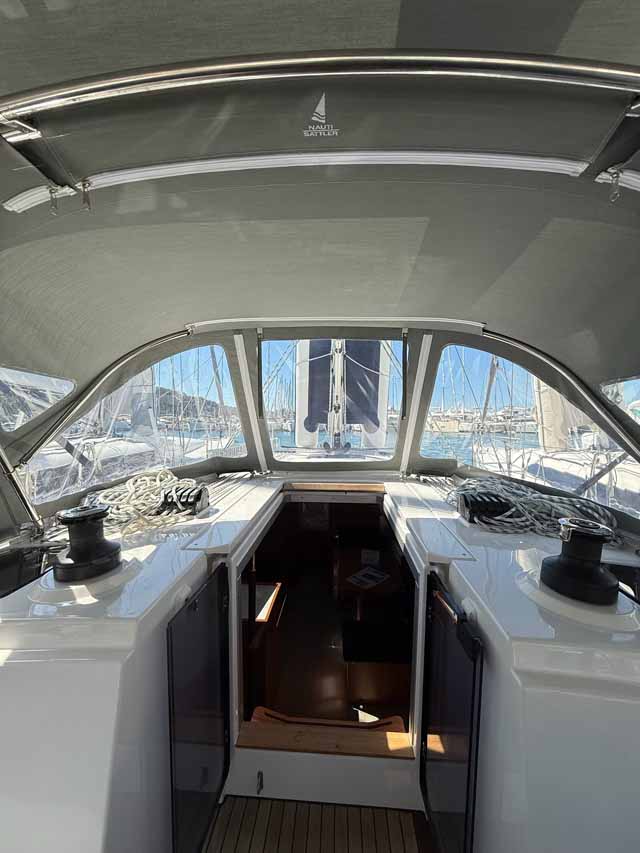 | Outside | 220V shore connection, Anchor with chain, Anchor winch, Bimini top, Boat hook, Cockpit shower, Cockpit speakers, Cockpit cushions, Cockpit table, Electr. anchor windlass, Folding propeller, Fender, Mooring lines, Gangway, Ball fender, Plastic bucket, Solar panels, Sprayhood, Water hose, Windex |